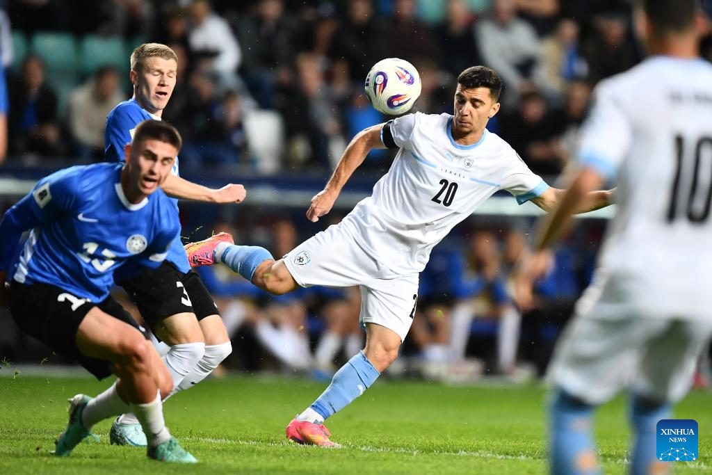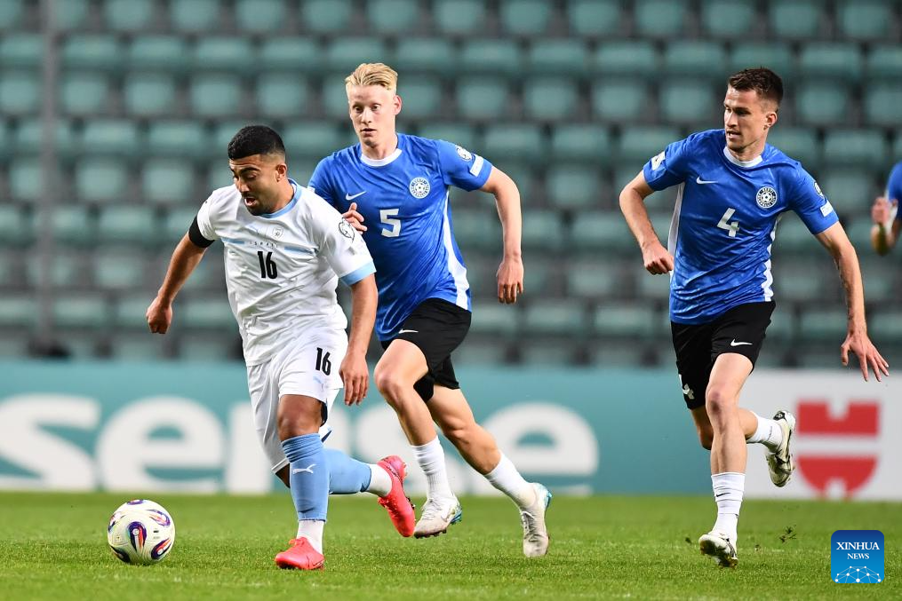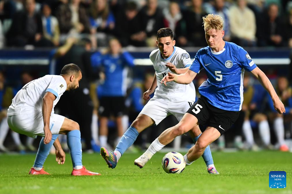 Marten Kuusk (L) of Estonia vies with Dor Turgeman (C) of Israel during the FIFA World Cup European Qualifiers match between Estonia and Israel at A Le Coq Arena in Tallinn, Estonia, on June 6, 2025 (Photo by Sergei Stepanov/Xinhua)