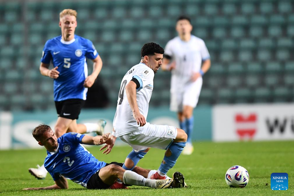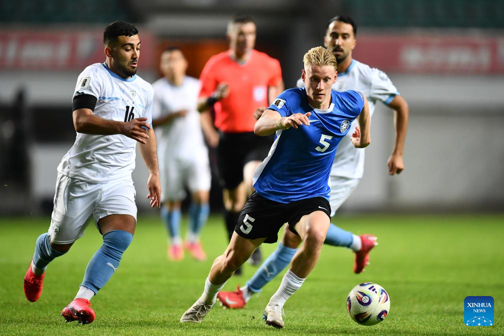 Maksim Paskotsi (1st L) of Estonia vies with Dan Biton (2nd R) of Israel during the FIFA World Cup European Qualifiers match between Estonia and Israel at A Le Coq Arena in Tallinn, Estonia, on June 6, 2025 (Photo by Sergei Stepanov/Xinhua)