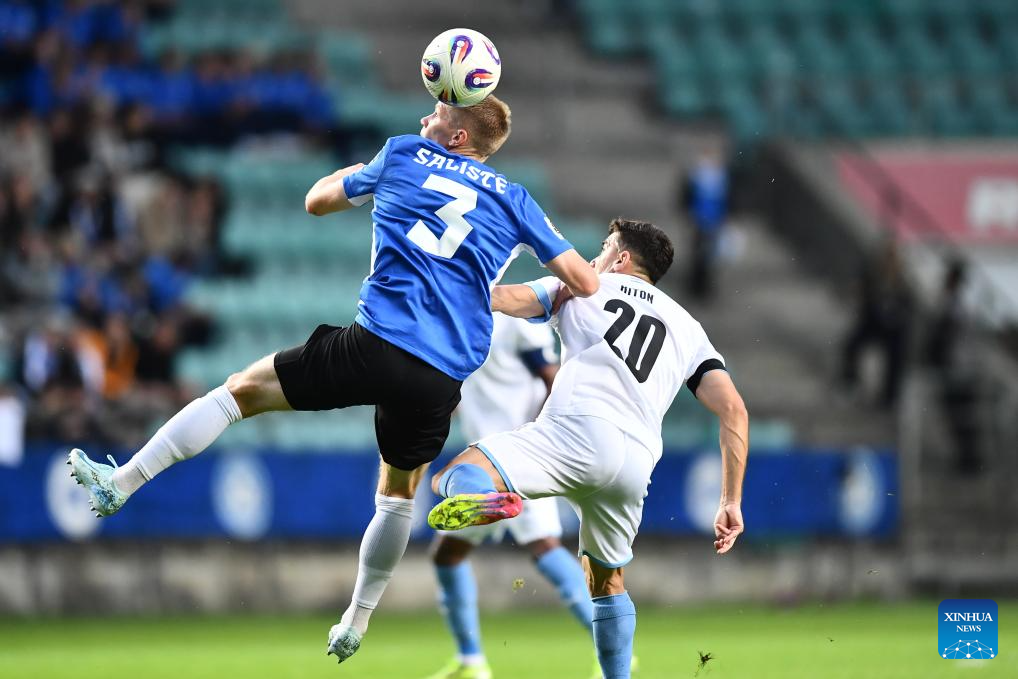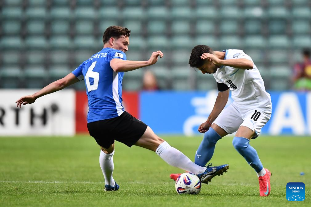 Marten Kuusk (L) of Estonia vies with Dor Turgeman of Israel during the FIFA World Cup European Qualifiers match between Estonia and Israel at A Le Coq Arena in Tallinn, Estonia, on June 6, 2025 (Photo by Sergei Stepanov/Xinhua)