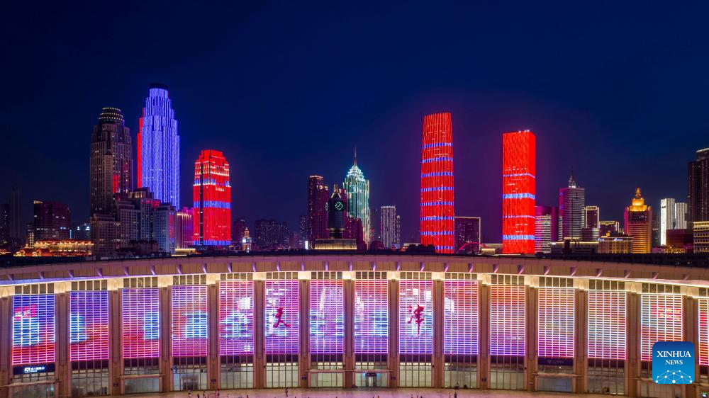 A drone photo taken on June 5, 2025 shows a night view along the Haihe River in north China's Tianjin. Tianjin has upgraded the lighting facilities of 216 buildings, 13 bridges, 8.2 kilometers of riverbanks and 7 docks along the Haihe River since the beginning of this year. The landscape lighting along the river has been greatly improved, outlining a distinctive night view of the city. (Xinhua/Zhao Zishuo)