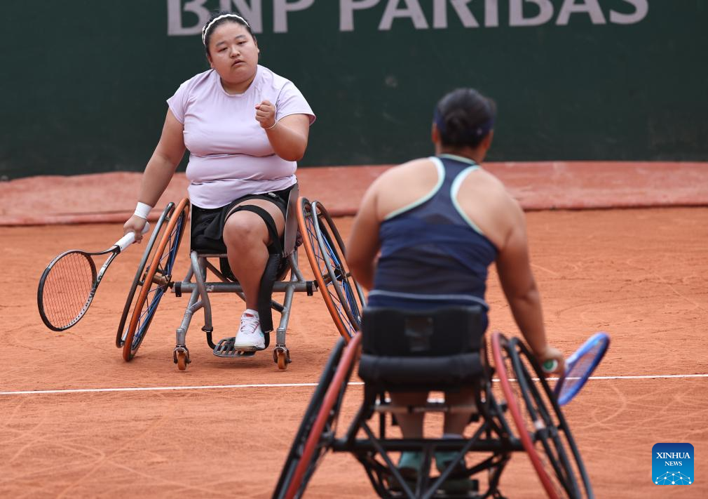 Li Xiaohui/Wang Ziying(L) celebrate a point during the wheelchair tennis women's doubles semifinal match between Pauline Deroulede of France/Aniek Van Koot of the Netherlands and Li Xiaohui/Wang Ziying of China at the French Open tennis tournament at Roland Garros, Paris, France, June 5, 2025. (Xinhua/Li Jing)
