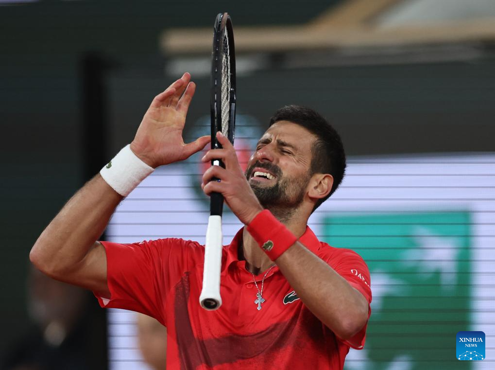 Novak Djokovic reacts during the men's singles semifinal match between Jannik Sinner of Italy and Novak Djokovic of Serbia at the French Open tennis tournament at Roland Garros, Paris, France, June 6, 2025. (Xinhua/Li Jing)
