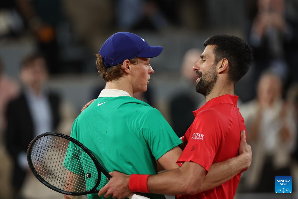Jannik Sinner (L) and Novak Djokovic hug each other after the men's singles semifinal match between Jannik Sinner of Italy and Novak Djokovic of Serbia at the French Open tennis tournament at Roland Garros, Paris, France, June 6, 2025. (Xinhua/Li Jing)