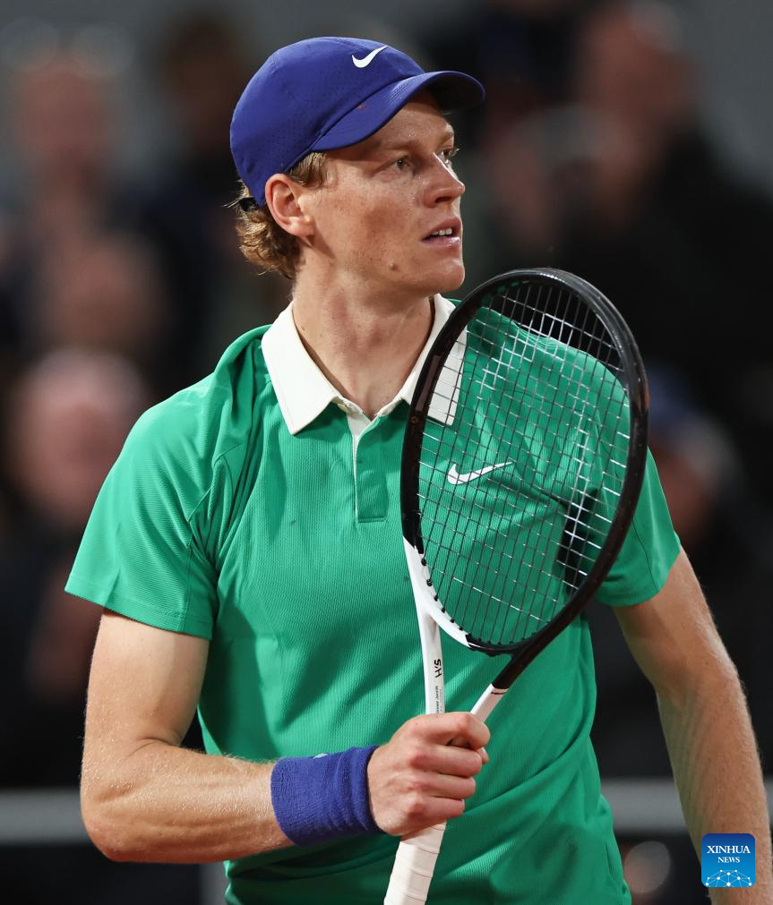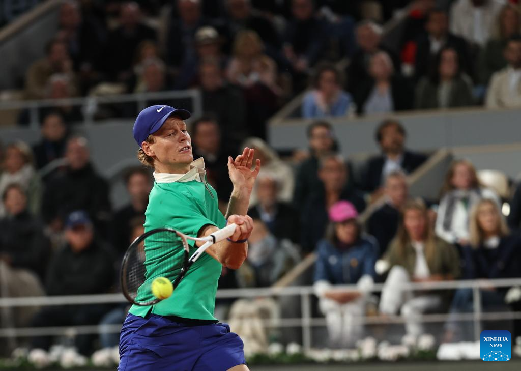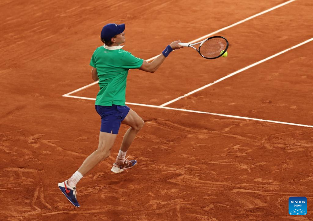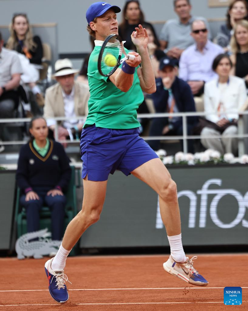 Jannik Sinner returns a shot during the men's singles semifinal match between Jannik Sinner of Italy and Novak Djokovic of Serbia at the French Open tennis tournament at Roland Garros, Paris, France, June 6, 2025. (Xinhua/Li Jing)