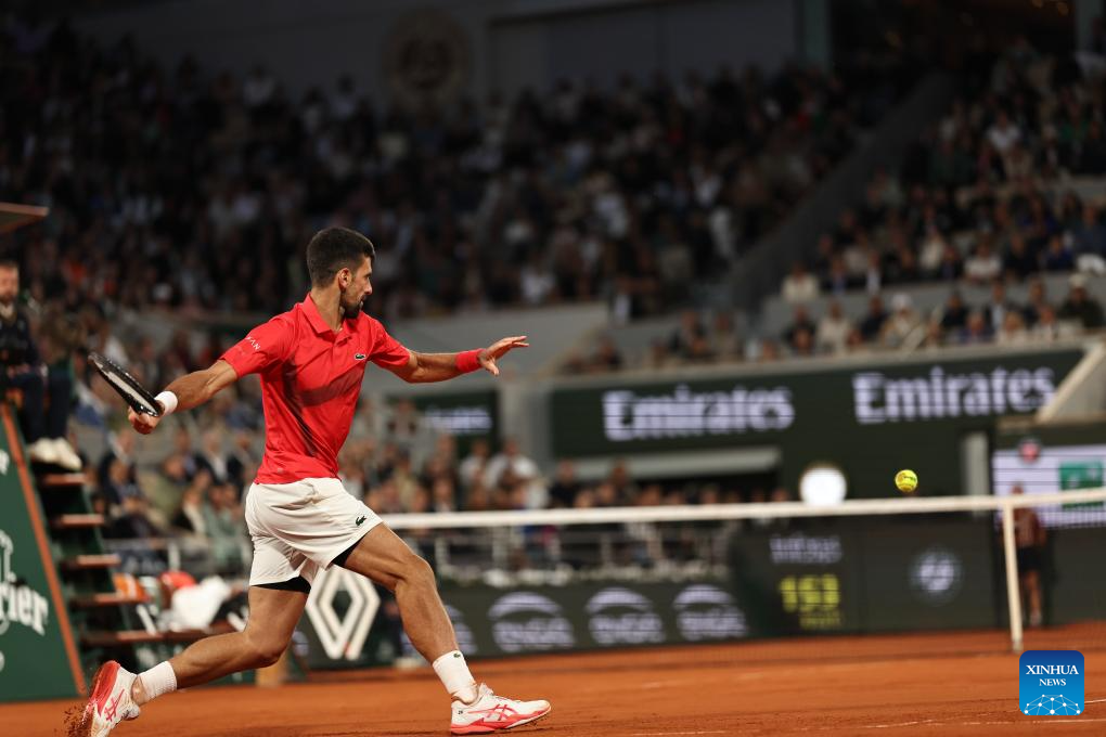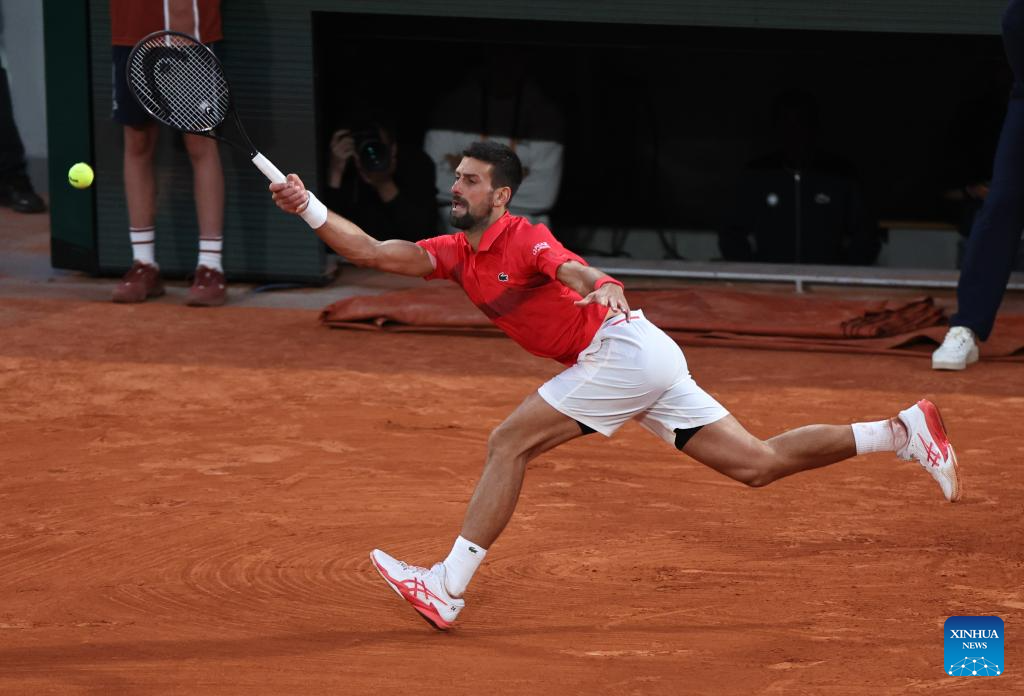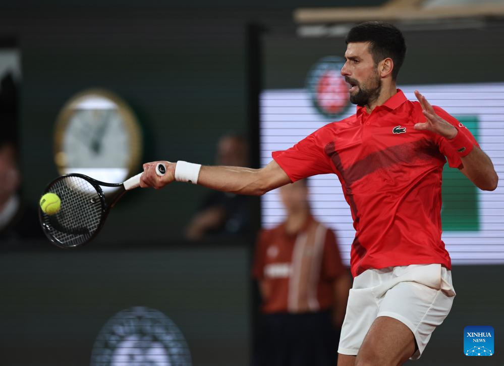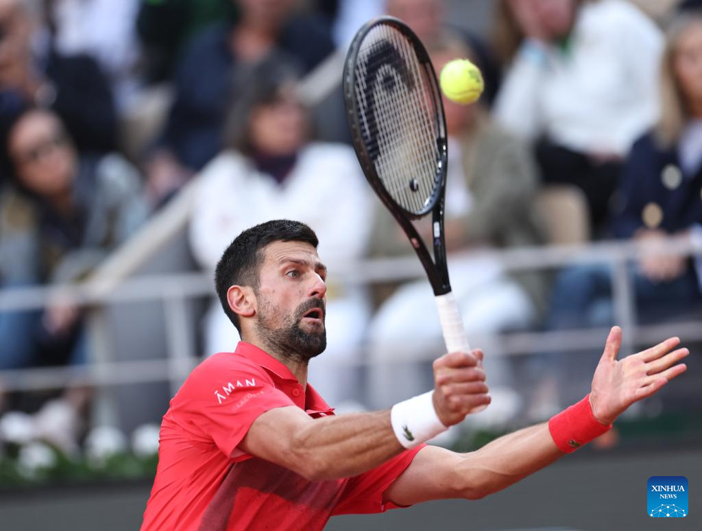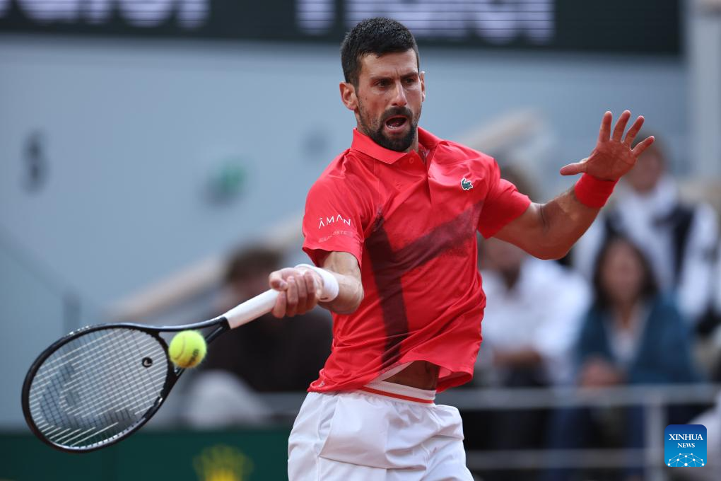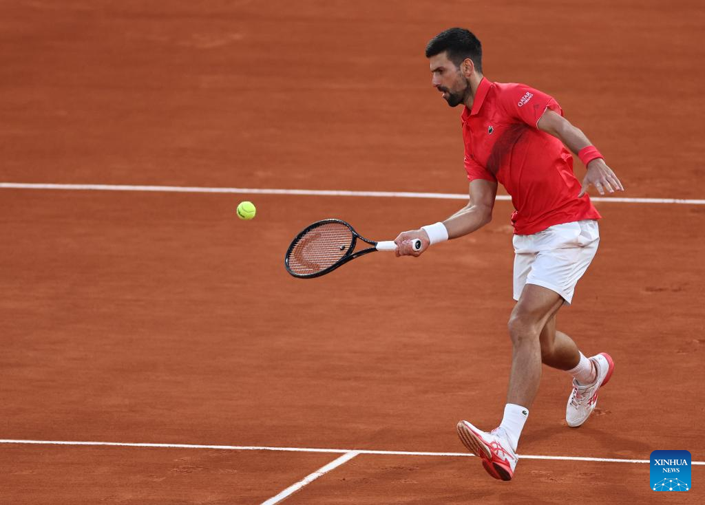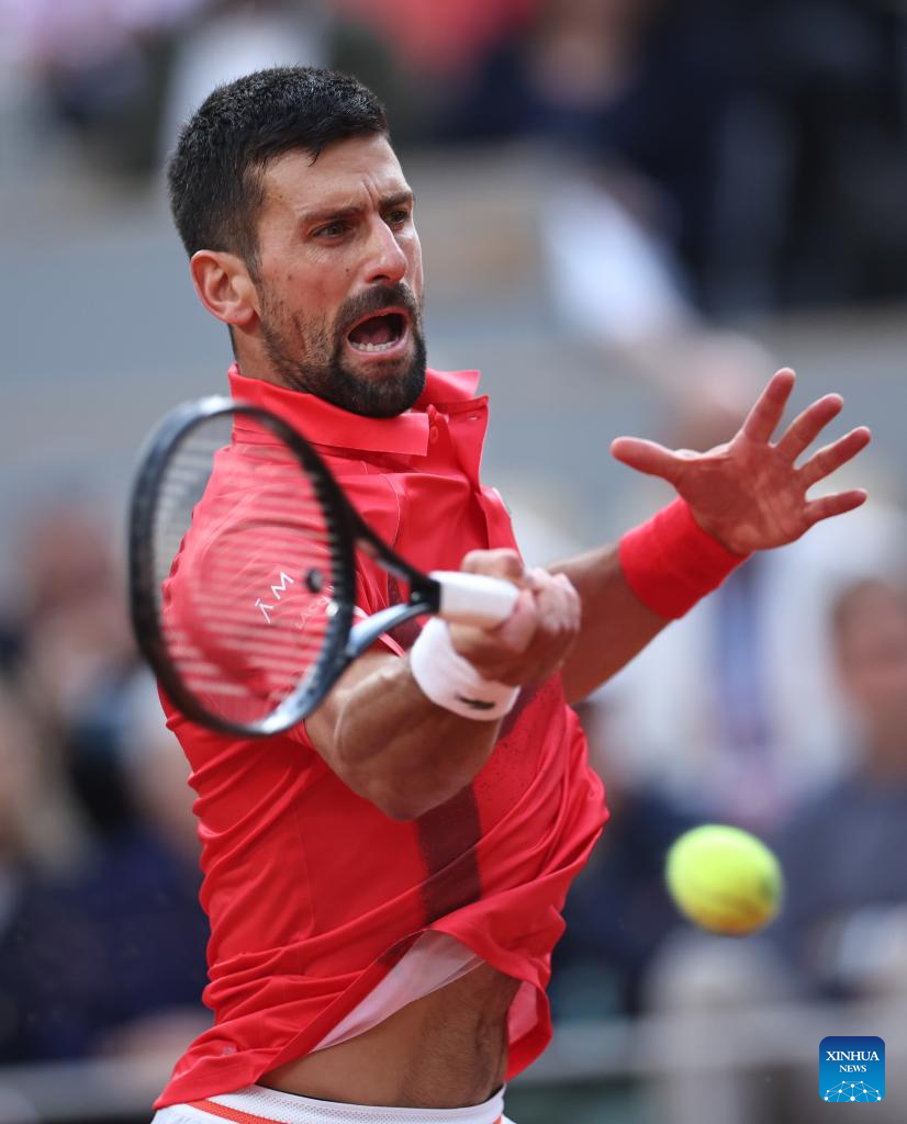 Novak Djokovic returns a shot during the men's singles semifinal match between Jannik Sinner of Italy and Novak Djokovic of Serbia at the French Open tennis tournament at Roland Garros, Paris, France, June 6, 2025. (Xinhua/Li Jing)