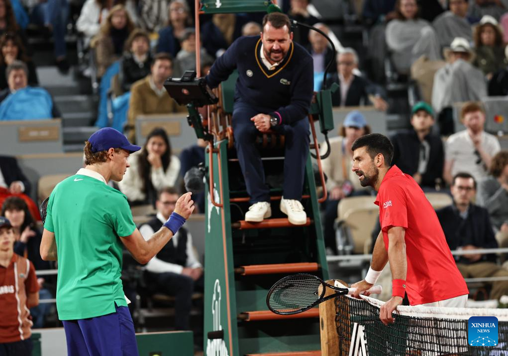 Jannik Sinner (L) and Novak Djokovic (R) communicate during the men's singles semifinal match between Jannik Sinner of Italy and Novak Djokovic of Serbia at the French Open tennis tournament at Roland Garros, Paris, France, June 6, 2025. (Xinhua/Li Jing)