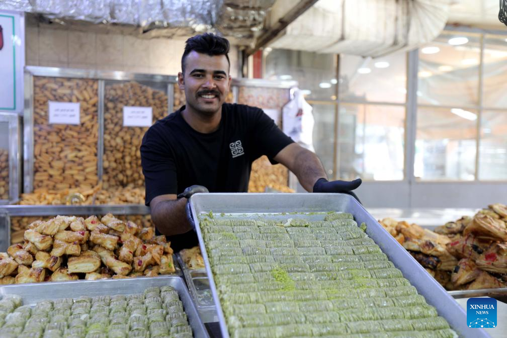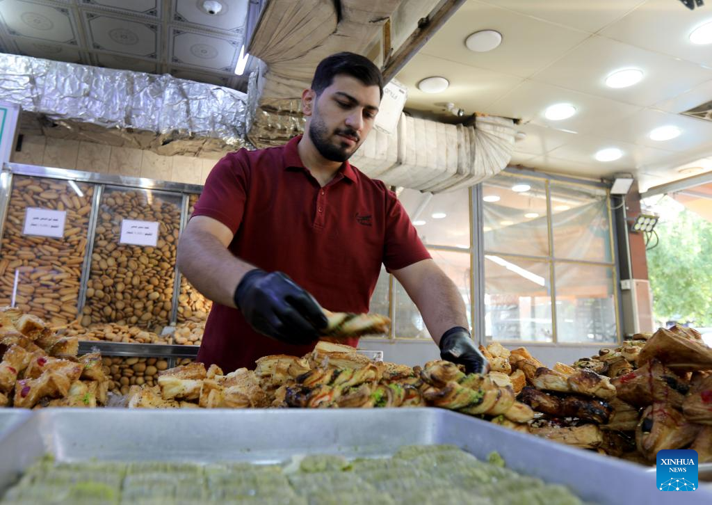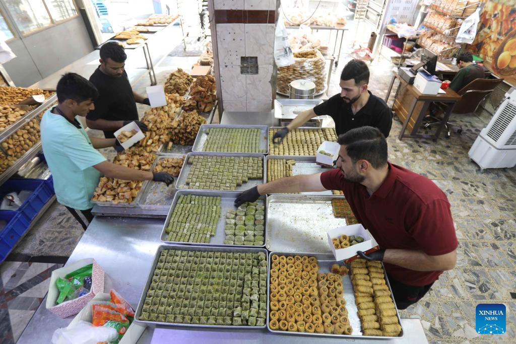 Workers prepare traditional sweets at a store during Eid al-Adha in Baghdad, Iraq, on June 6, 2025. (Xinhua/Khalil Dawood)