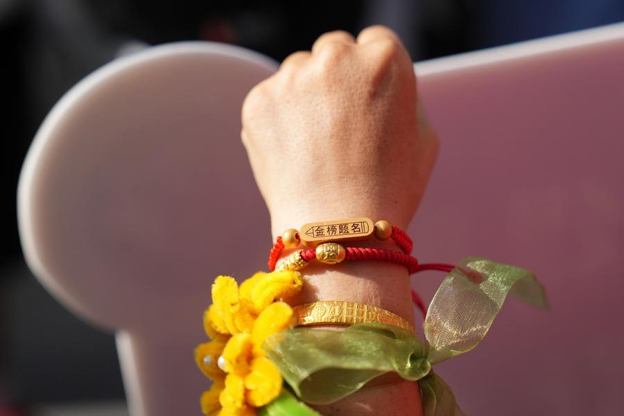 A teacher wears a bracelet with the words "score high in the exam" outside a national college entrance examination site in Beijing, capital of China, June 7, 2025. (Xinhua/Ju Huanzong)