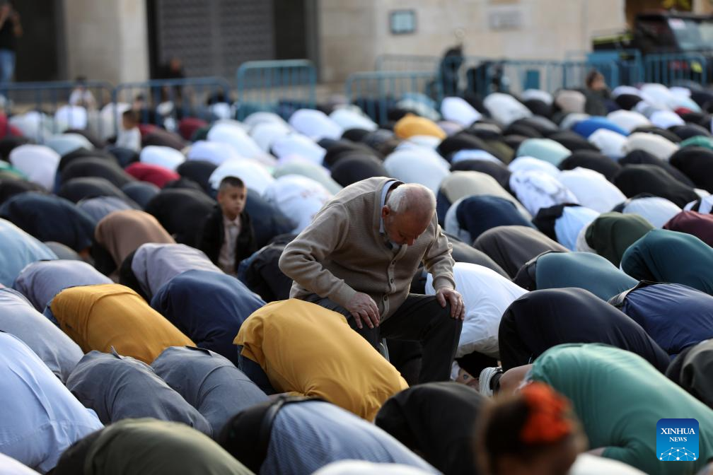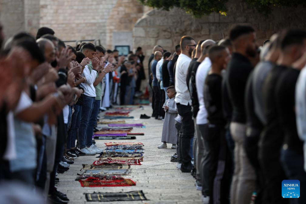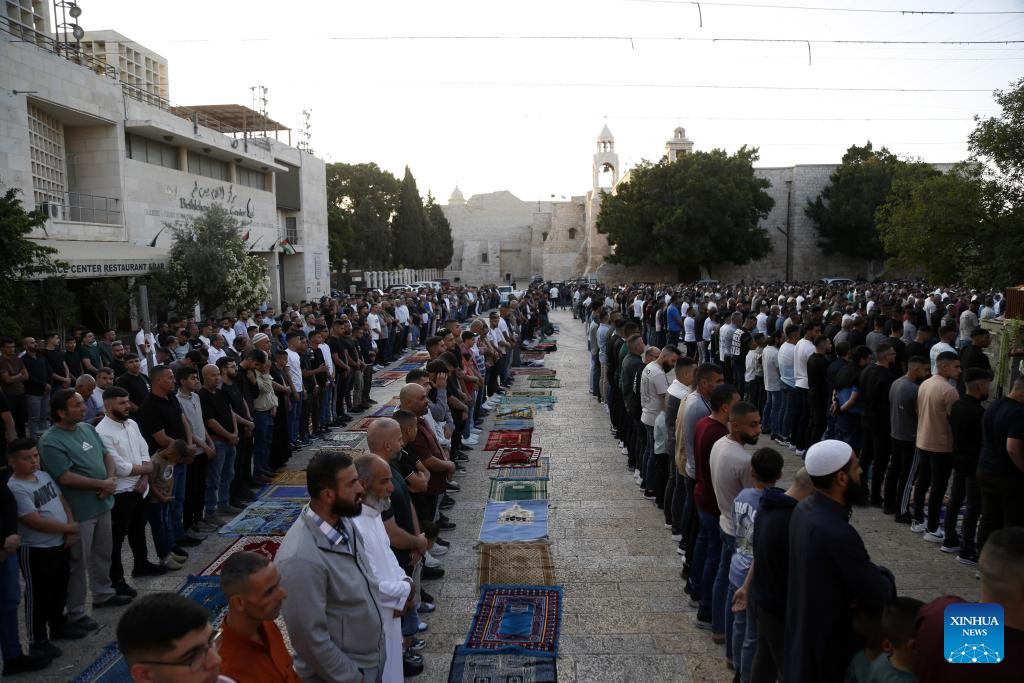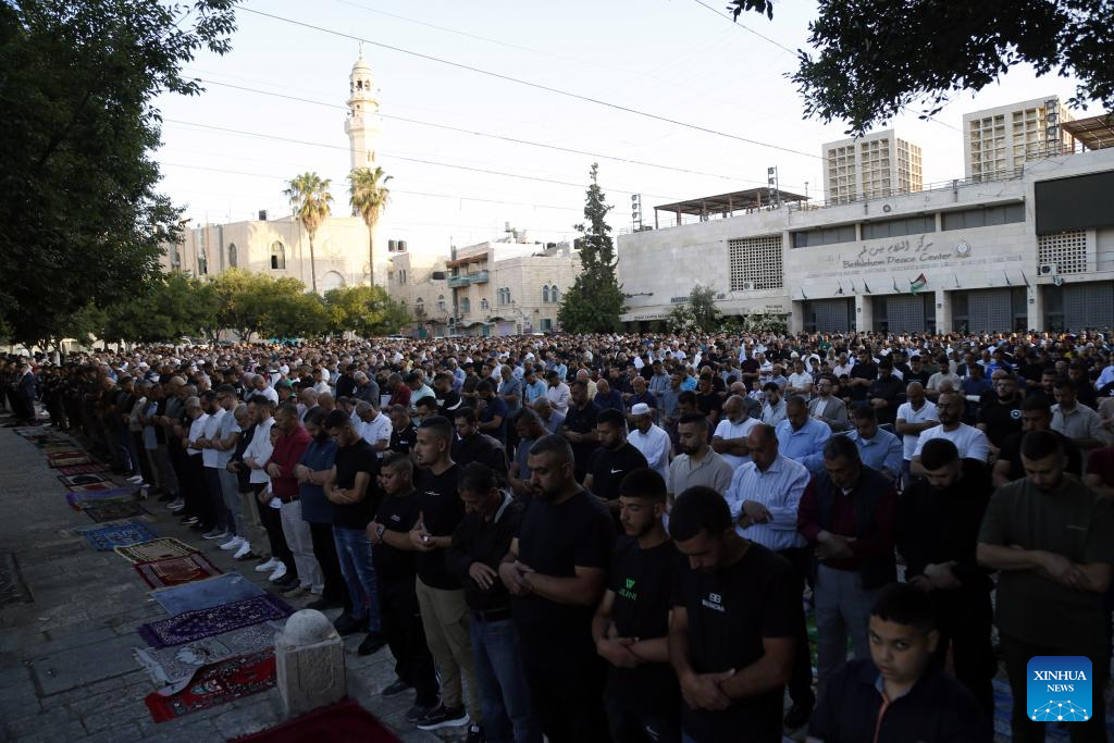 Palestinians offer prayers to celebrate Eid al-Adha in the West Bank city of Bethlehem, on June 6, 2025. (Photo by Mamoun Wazwaz/Xinhua)