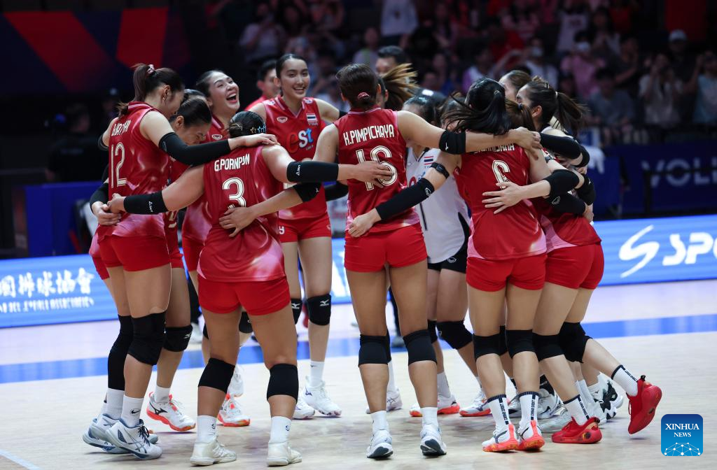 Players of Thailand celebrate winning the Pool 3 match between France and Thailand at the Women's Volleyball Nations League (VNL) 2025 at the National Indoor Stadium in Beijing, China, June 8, 2025. (Xinhua/Luo Yuan)