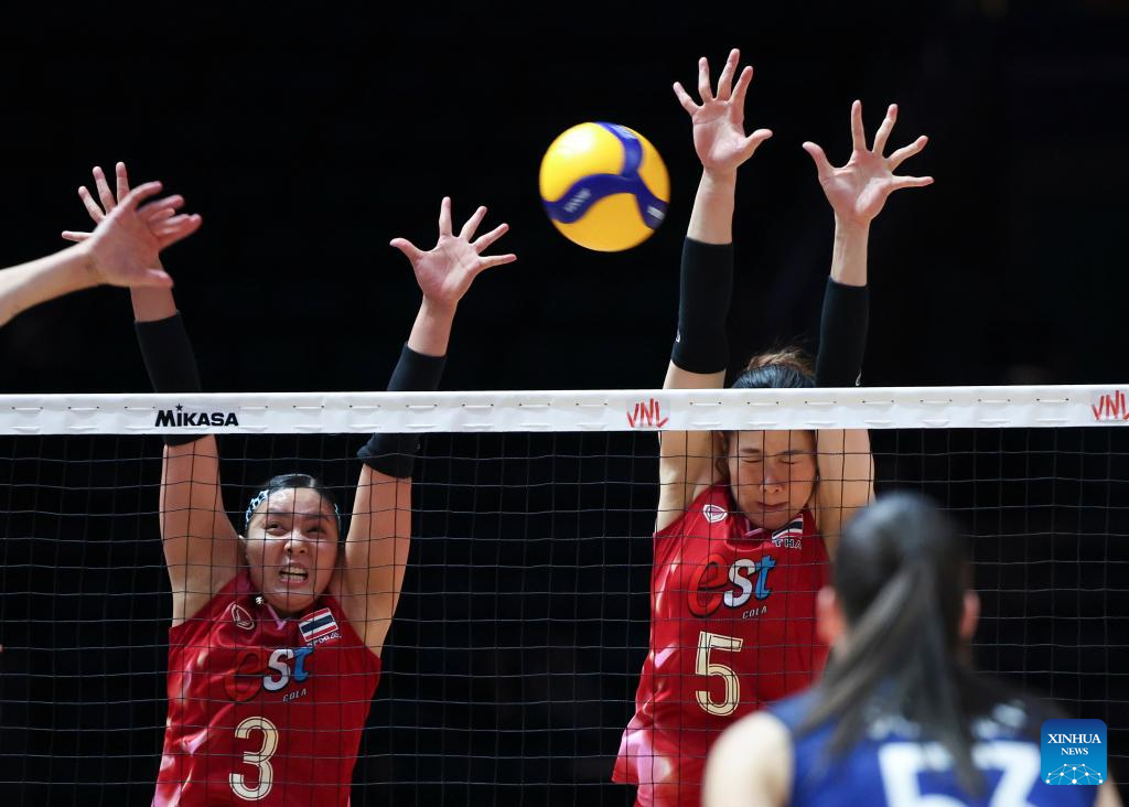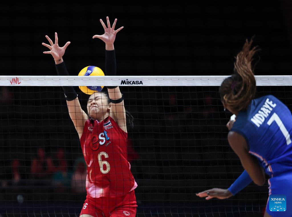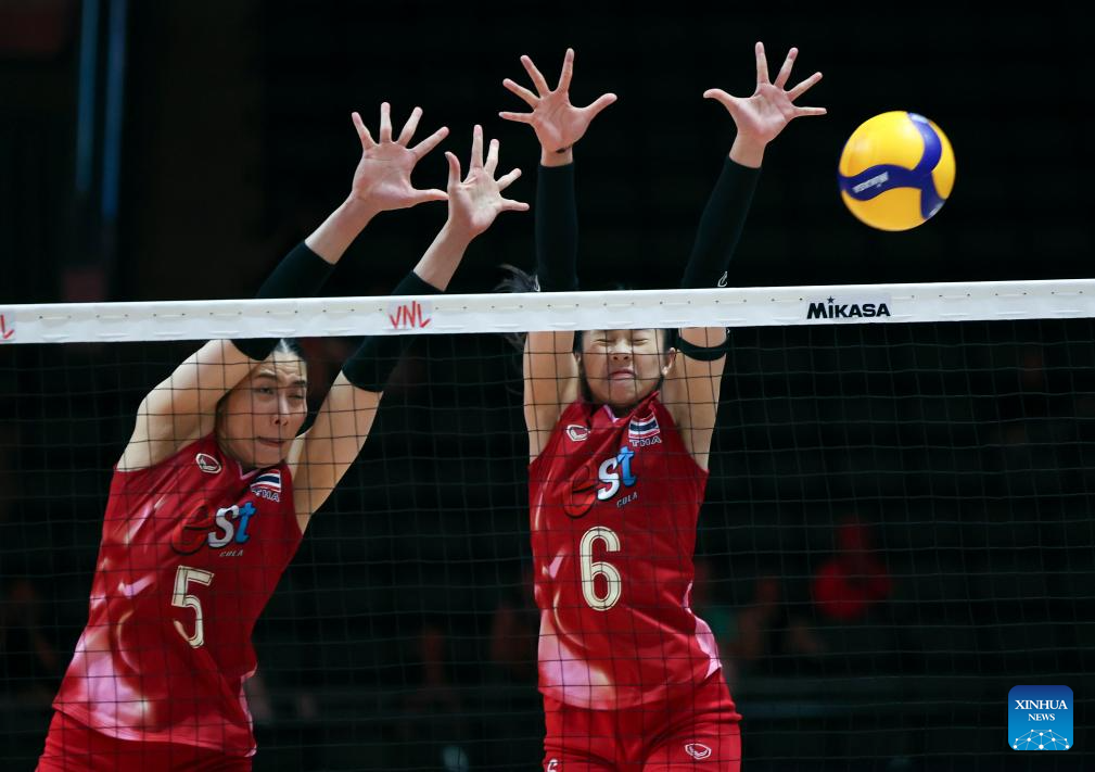 Thailand's Warisara Seetaloed (L) blocks the ball during the Pool 3 match between France and Thailand at the Women's Volleyball Nations League (VNL) 2025 at the National Indoor Stadium in Beijing, China, June 8, 2025. (Xinhua/Luo Yuan)