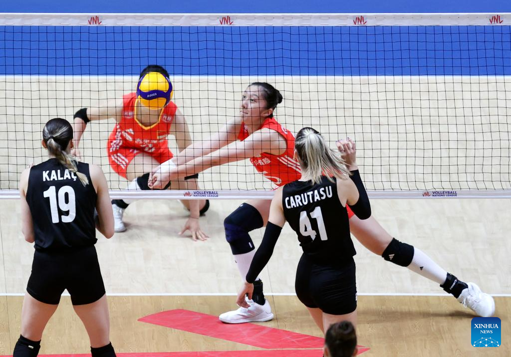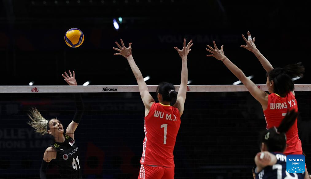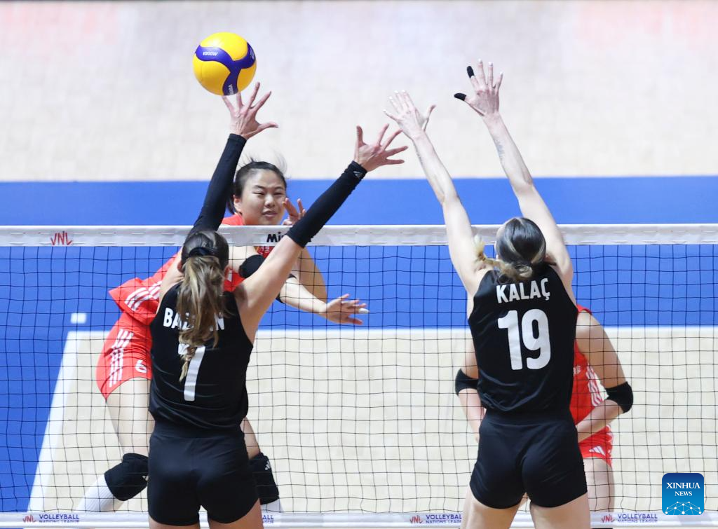 Türkiye's Aleksia Karutasu (L) spikes the ball during the Pool 3 match between China and Türkiye at the Women's Volleyball Nations League (VNL) 2025 Beijing at the National Indoor Stadium in Beijing, China, June 8, 2025. (Xinhua/Han Yan)