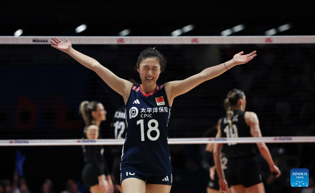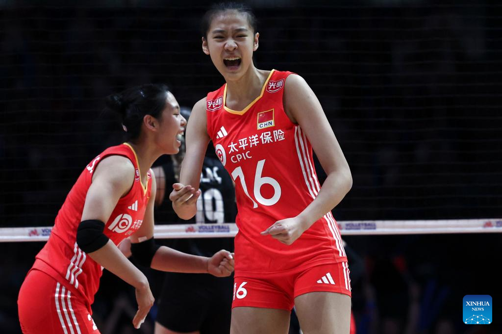 China's Zhuang Yushan (R) celebrates during the Pool 3 match between China and Türkiye at the Women's Volleyball Nations League (VNL) 2025 Beijing at the National Indoor Stadium in Beijing, China, June 8, 2025. (Xinhua/Han Yan)