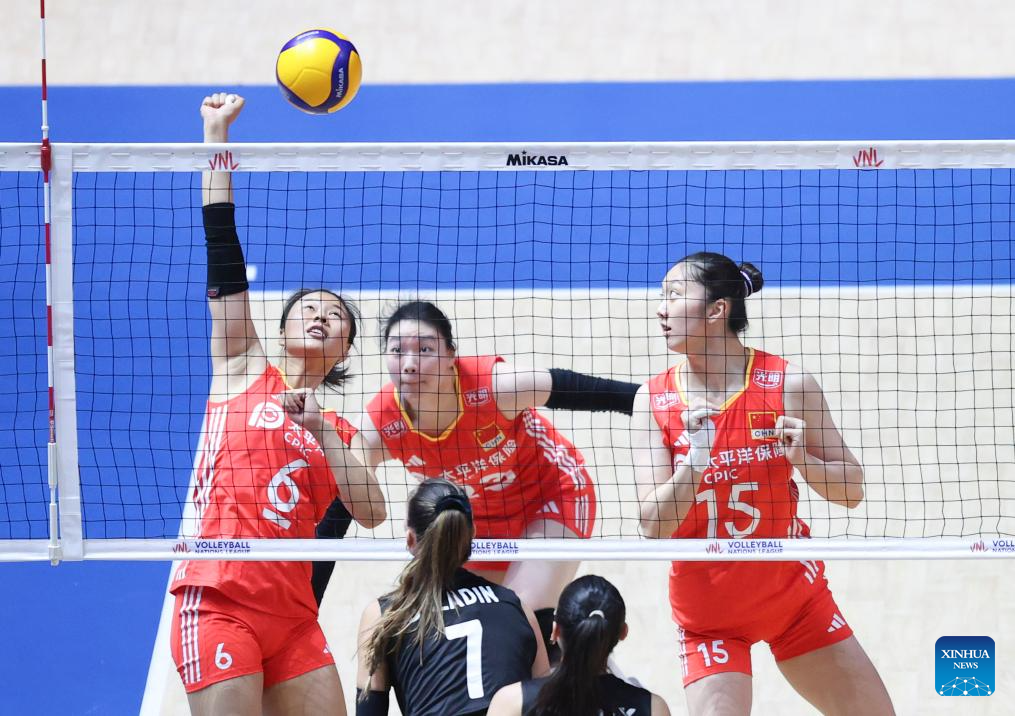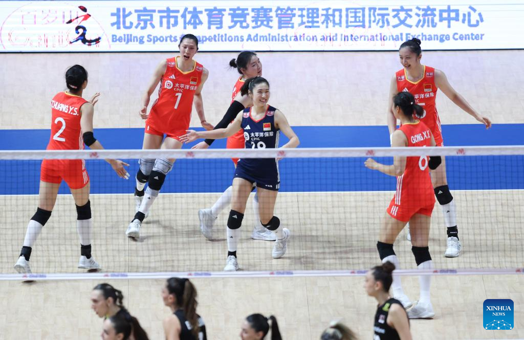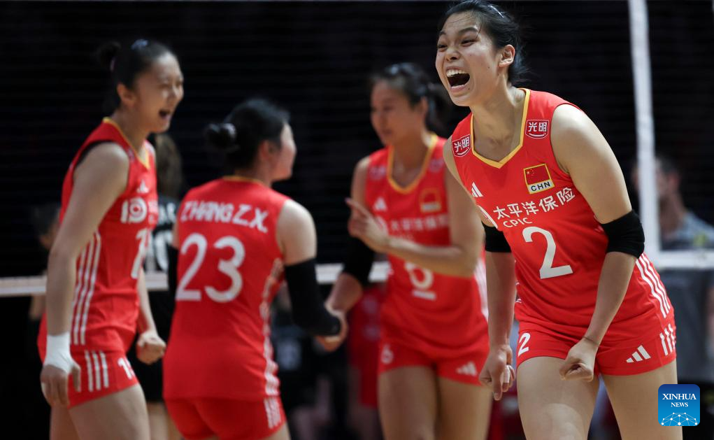 Players of China celebrate scoring during the Pool 3 match between China and Türkiye at the Women's Volleyball Nations League (VNL) 2025 Beijing at the National Indoor Stadium in Beijing, China, June 8, 2025. (Xinhua/Luo Yuan)