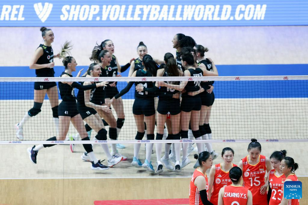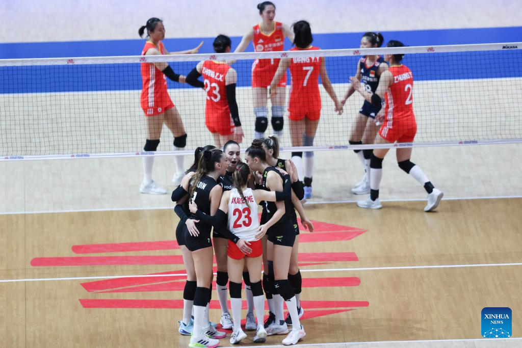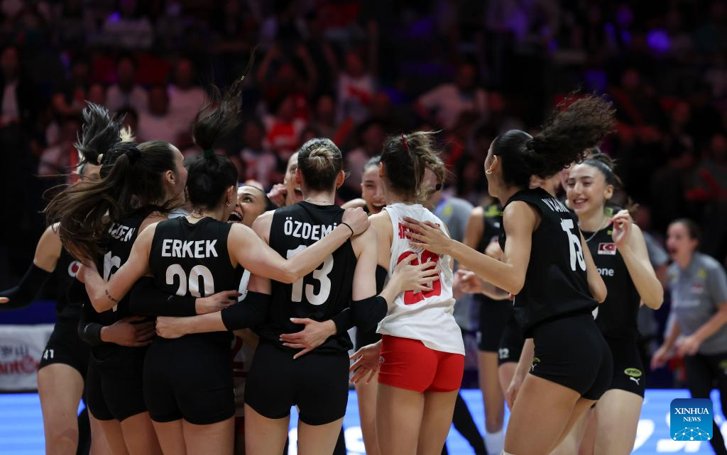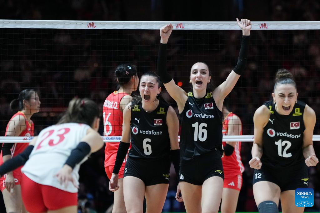 Players of Türkiye celebrate scoring during the Pool 3 match between China and Türkiye at the Women's Volleyball Nations League (VNL) 2025 Beijing at the National Indoor Stadium in Beijing, China, June 8, 2025. (Xinhua/Ju Huanzong)
