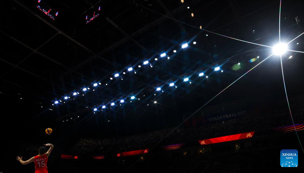 China's Chen Houyu serves during the Pool 3 match between China and Türkiye at the Women's Volleyball Nations League (VNL) 2025 Beijing at the National Indoor Stadium in Beijing, China, June 8, 2025. (Xinhua/Han Yan)