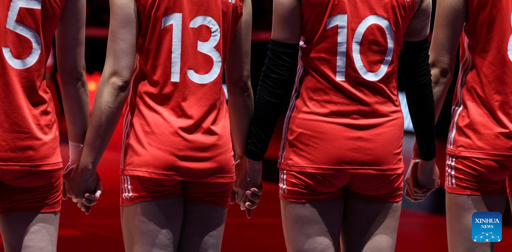 Players of China hold hands for the national anthem before the Pool 3 match between China and Türkiye at the Women's Volleyball Nations League (VNL) 2025 Beijing at the National Indoor Stadium in Beijing, China, June 8, 2025. (Xinhua/Han Yan)
