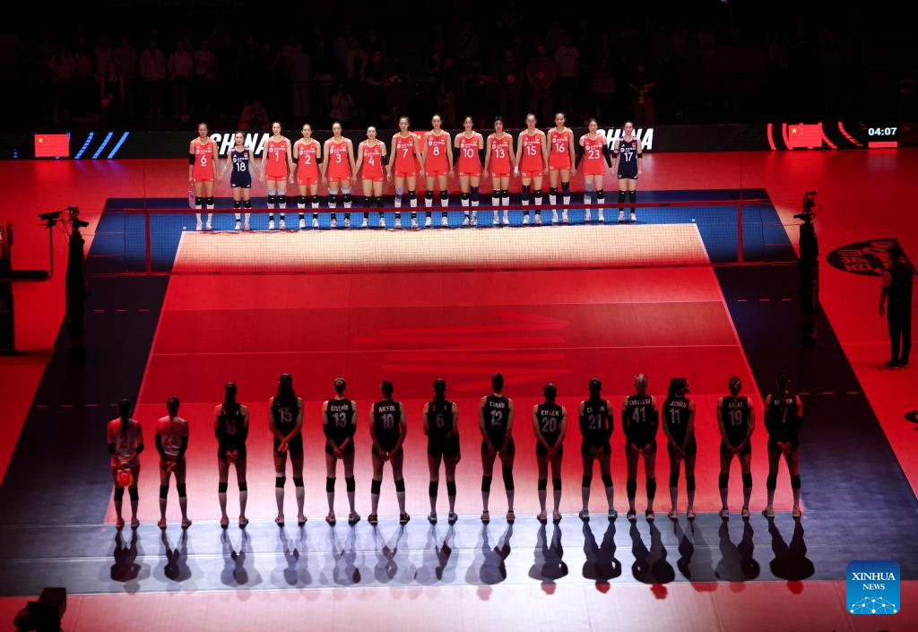 Players of China stand in line for the national anthem before the Pool 3 match between China and Türkiye at the Women's Volleyball Nations League (VNL) 2025 Beijing at the National Indoor Stadium in Beijing, China, June 8, 2025. (Xinhua/Luo Yuan)