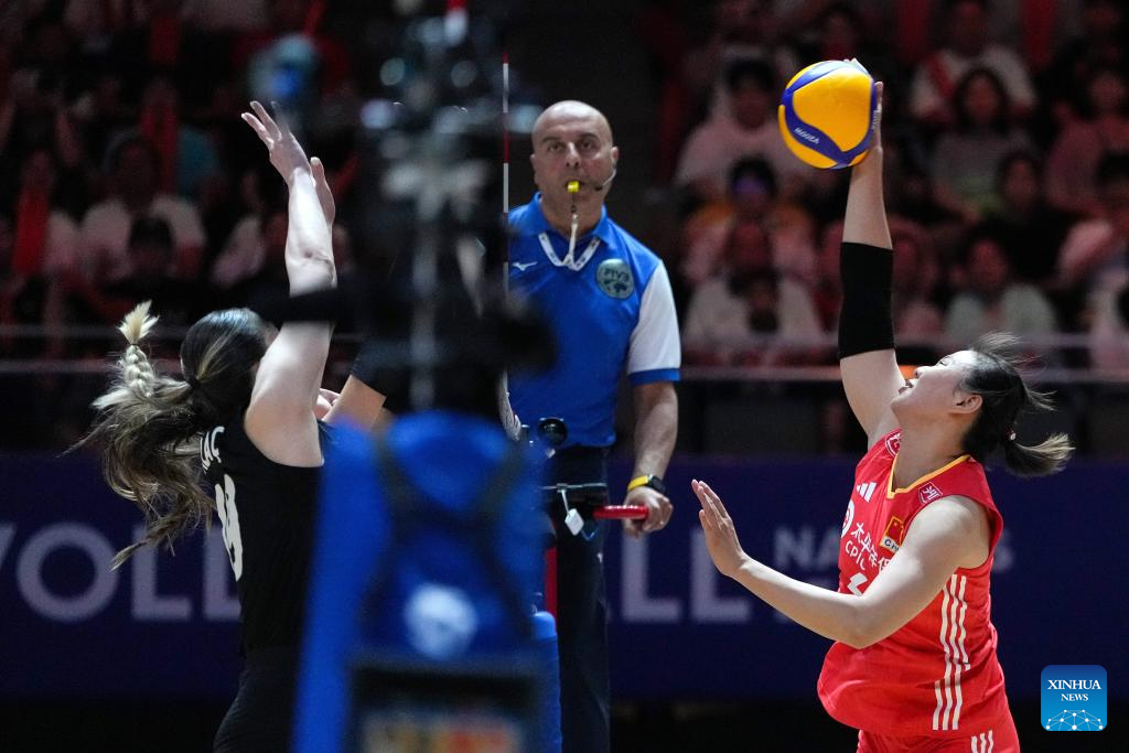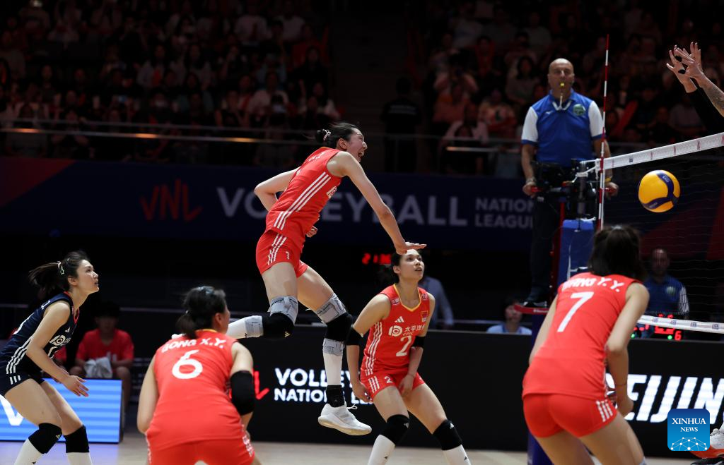 China's Wu Mengjie (Top) spikes the ball during the Pool 3 match between China and Türkiye at the Women's Volleyball Nations League (VNL) 2025 Beijing at the National Indoor Stadium in Beijing, China, June 8, 2025. (Xinhua/Han Yan)