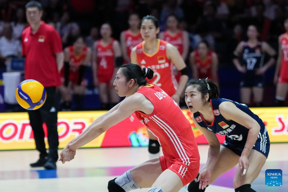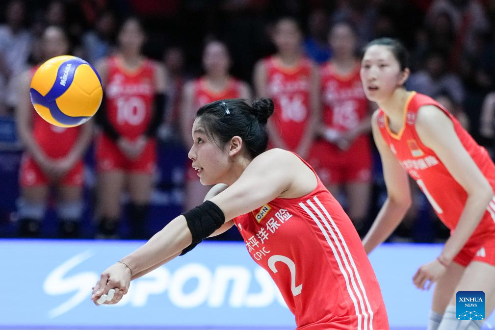 China's Wu Mengjie (Front L) saves the ball during the Pool 3 match between China and Türkiye at the Women's Volleyball Nations League (VNL) 2025 Beijing at the National Indoor Stadium in Beijing, China, June 8, 2025. (Xinhua/Ju Huanzong)