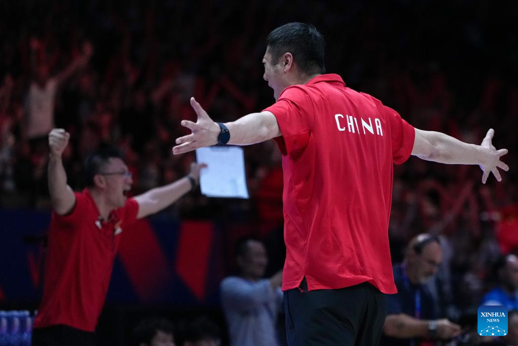 China's head coach Zhao Yong celebrates scoring during the Pool 3 match between China and Türkiye at the Women's Volleyball Nations League (VNL) 2025 Beijing at the National Indoor Stadium in Beijing, China, June 8, 2025. (Xinhua/Ju Huanzong)