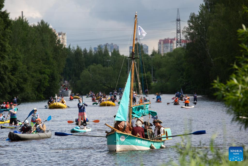 People participate in a Petrovskiy canoe marathon in St. Petersburg, Russia, June 7, 2025. The canoe marathon attracted over 3,000 participants. (Photo by Irina Motina/Xinhua)