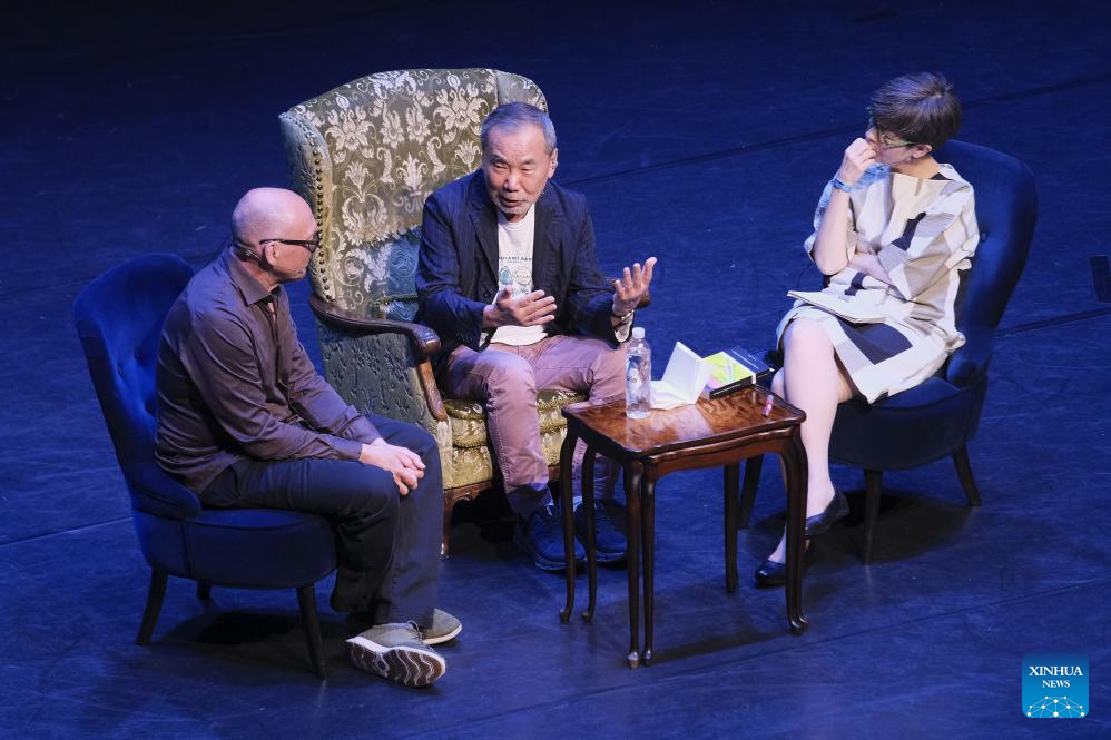 Japanese author Haruki Murakami (C) speaks during an event at the 2025 Norwegian Festival of Literature in Lillehammer, Norway, on June 7, 2025. The 2025 Norwegian Festival of Literature, the largest literary festival in the Nordic region, concluded on Sunday after a week of vibrant events that drew tens of thousands of visitors and featured acclaimed authors from across the globe. (Photo by Chen Yaqin/Xinhua)