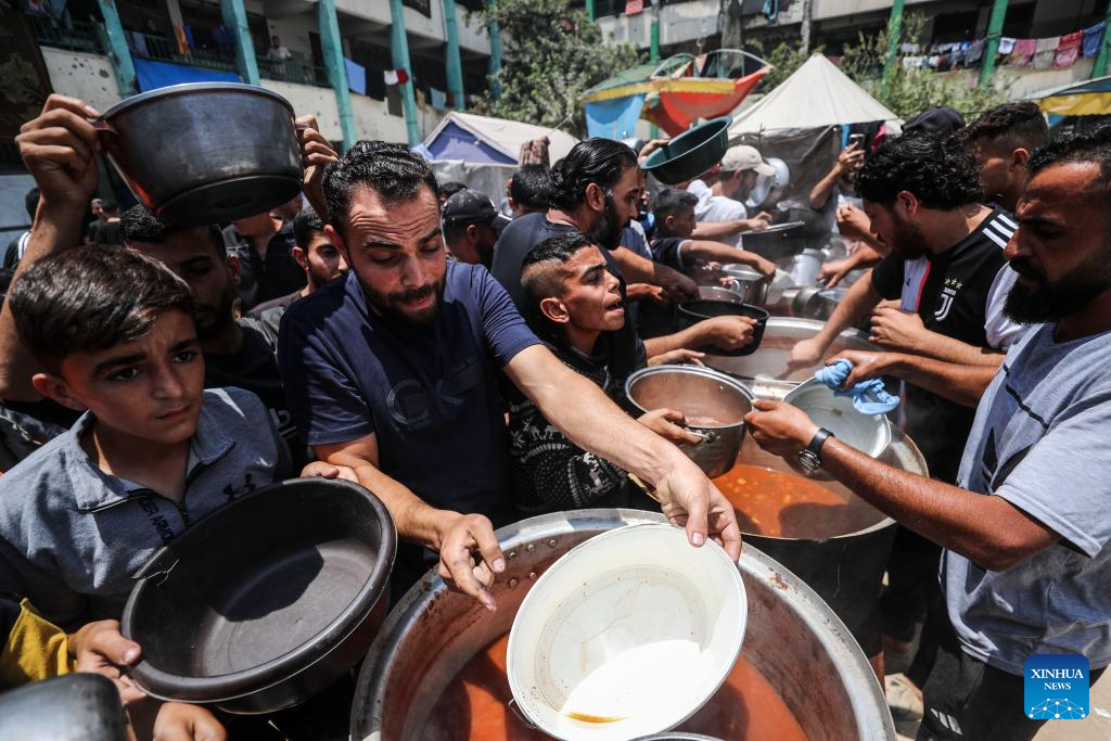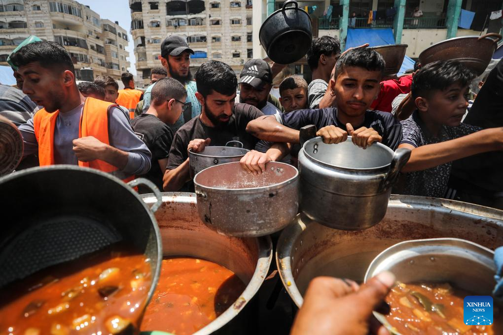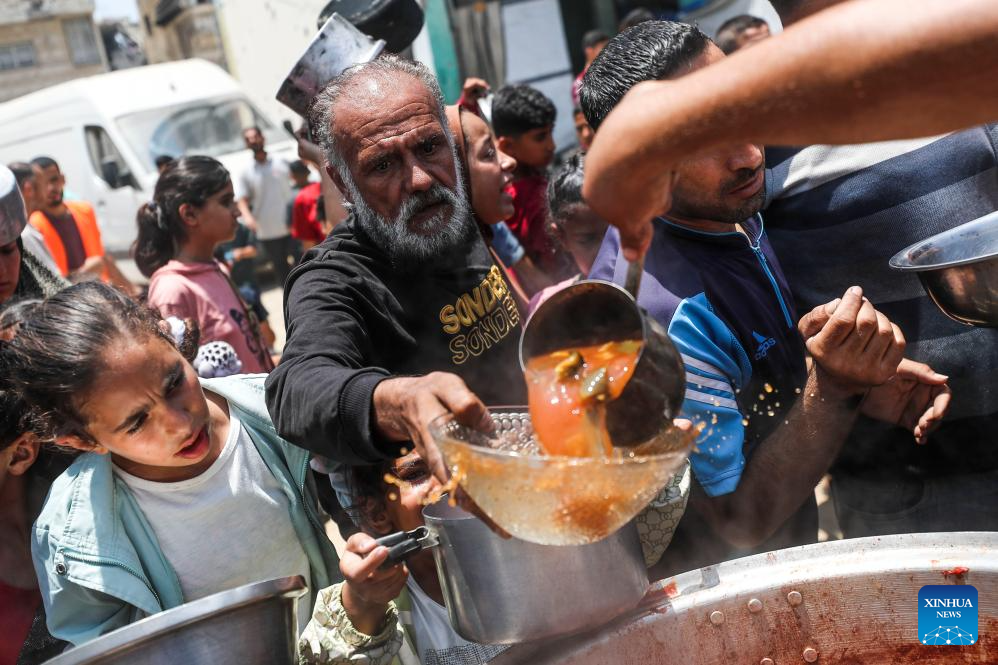 Palestinians receive free food at a food distribution center in the al-Shati refugee camp, west of Gaza City, on June 7, 2025. (Photo by Mahmoud Zaki/Xinhua)