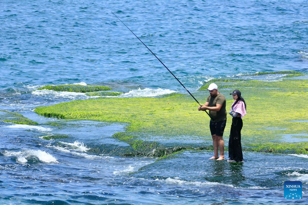 Citizens enjoy fishing during the Eid al-Adha holiday on the beach in Sidon, Lebanon, on June 7, 2025. (Photo by Ali Hashisho/Xinhua)