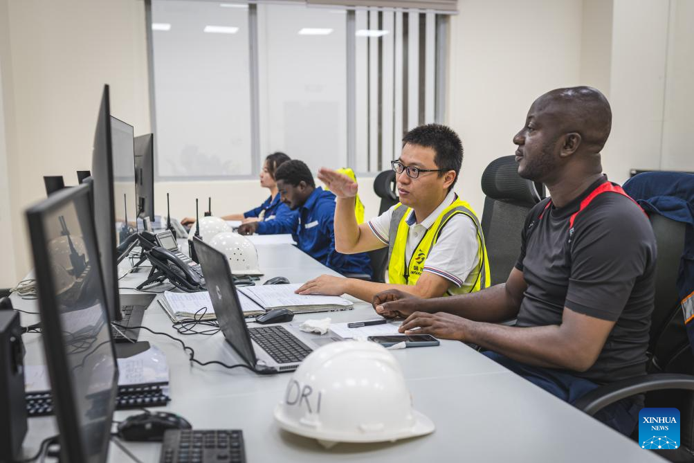 Hou Bing (2nd R), chief engineer of the Gribo-Popoli Hydroelectric Power Plant, monitors the operation of the power plant with local technicians in Soubre, Cote d'Ivoire, May 29, 2025. (Xinhua/Wang Guansen)