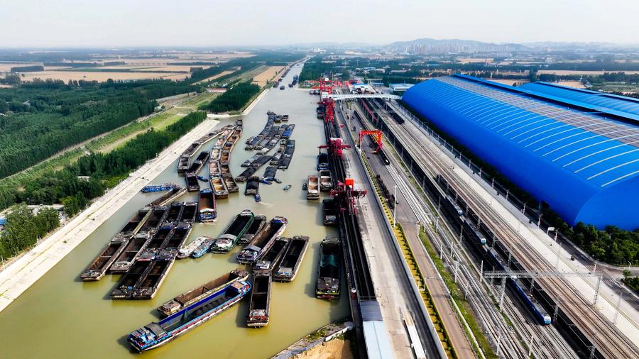 An aerial drone photo taken on June 8, 2025 shows ships docking for coal transportation at Liangshan Port in Jining, east China's Shandong Province. (Xinhua/Guo Xulei)