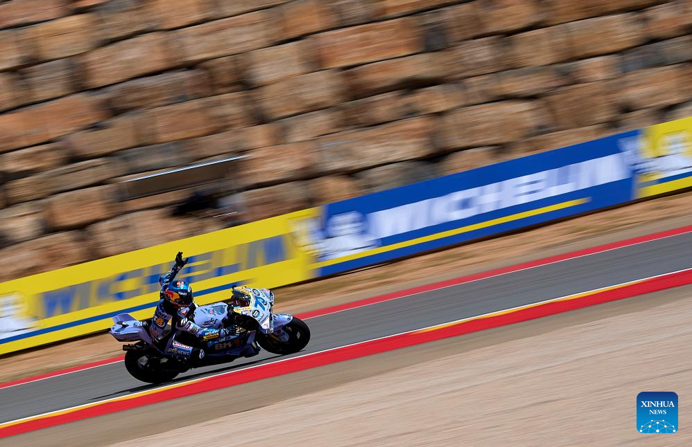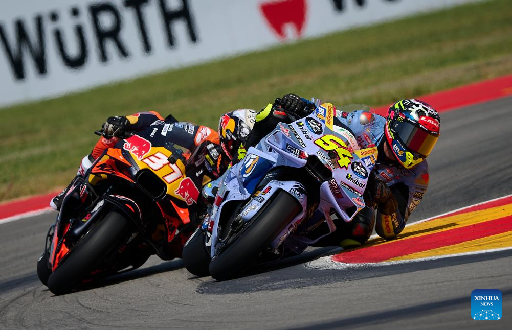 Riders compete during the Sprint Race of the MotoGp Aragon Grand Prix at Motorland Aragon circuit, Alcaniz, Spain, on June 7, 2025. (Str/Xinhua)