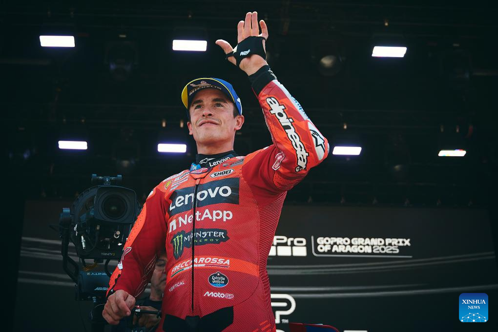 Marc Marquez of Ducati Lenovo Team reacts at the podium after the Sprint Race of the MotoGp Aragon Grand Prix at Motorland Aragon circuit, Alcaniz, Spain, on June 7, 2025. (Str/Xinhua)