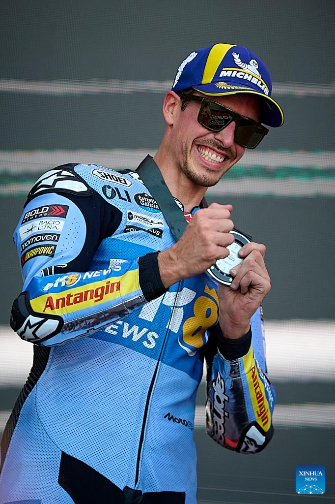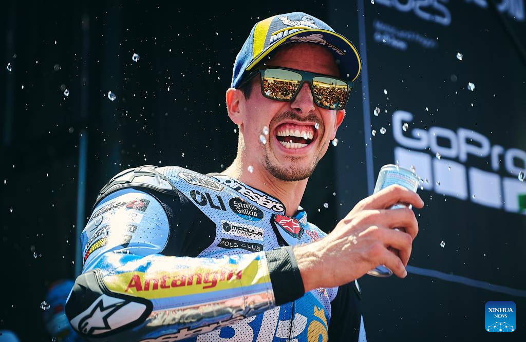Alex Marquez of BK8 Gresini Racing MotoGP celebrates at the podium after the Sprint Race of the MotoGp Aragon Grand Prix at Motorland Aragon circuit, Alcaniz, Spain, on June 7, 2025. (Str/Xinhua)