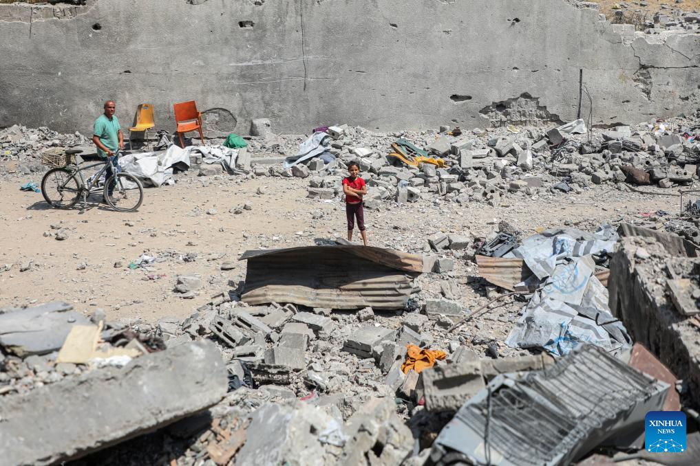 Palestinians are seen among the rubble of buildings destroyed in an Israeli airstrike in Gaza City, June 7, 2025. (Photo by Rizek Abdeljawad/Xinhua)