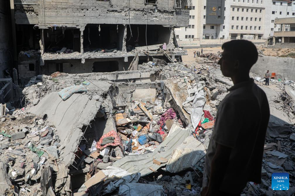 Palestinians stand inside a building destroyed in an Israeli airstrike in Gaza City, June 7, 2025. (Photo by Rizek Abdeljawad/Xinhua)