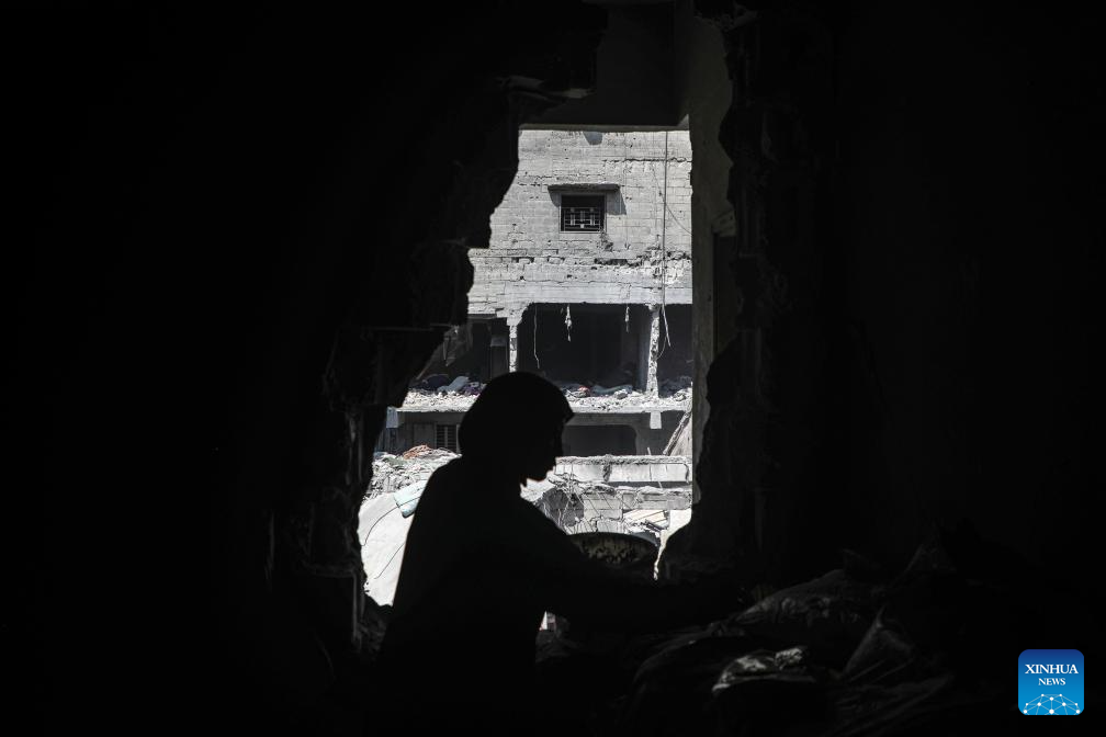 A Palestinian is seen inside a building destroyed in an Israeli airstrike in Gaza City, June 7, 2025. (Photo by Rizek Abdeljawad/Xinhua)