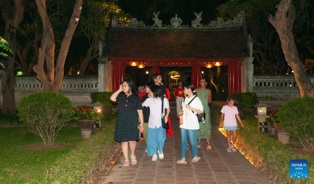 Tourists take a night tour at Temple of Literature in Hanoi, Vietnam, June 4, 2025. In the Vietnamese capital of Hanoi, the Temple of Literature, known locally as Van Mieu, has begun using digital projection technologies to present its cultural heritage in a new light, drawing growing interest from both local and international visitors.
