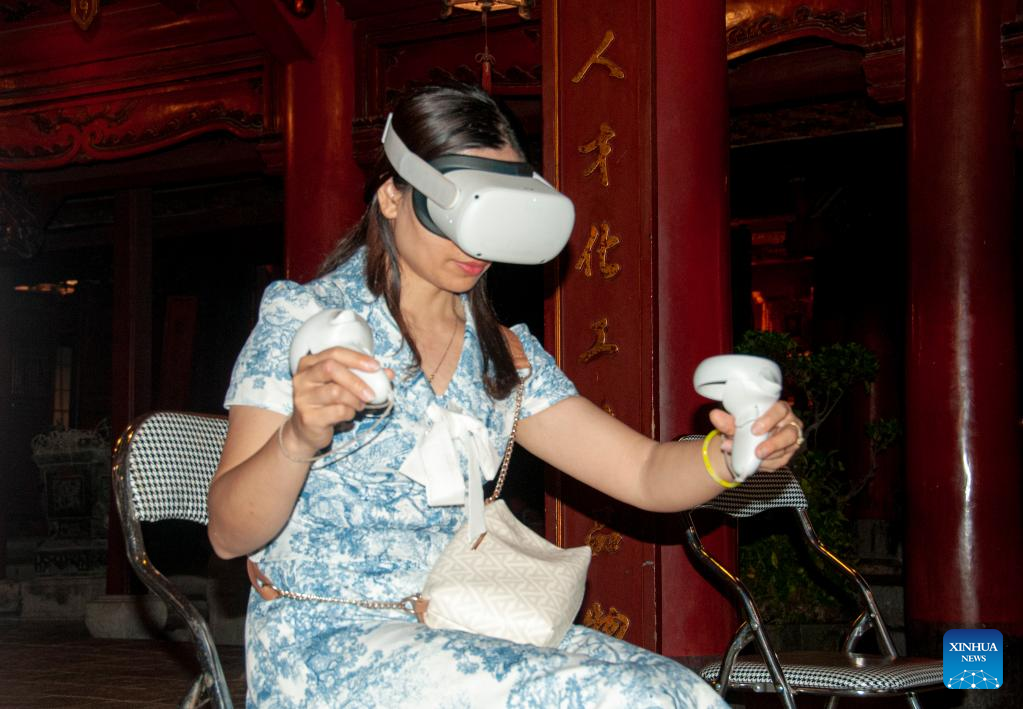 A woman tries an AR/VR application at Temple of Literature in Hanoi, Vietnam, June 4, 2025. In the Vietnamese capital of Hanoi, the Temple of Literature, known locally as Van Mieu, has begun using digital projection technologies to present its cultural heritage in a new light, drawing growing interest from both local and international visitors. Built in 1070 during Vietnam's Ly Dynasty, the site is one of the country's oldest and most revered historical landmarks, originally established to honor Confucius and later serving as Vietnam's first national university, Quoc Tu Giam. (Photo by Dang Hong Dung/Xinhua)