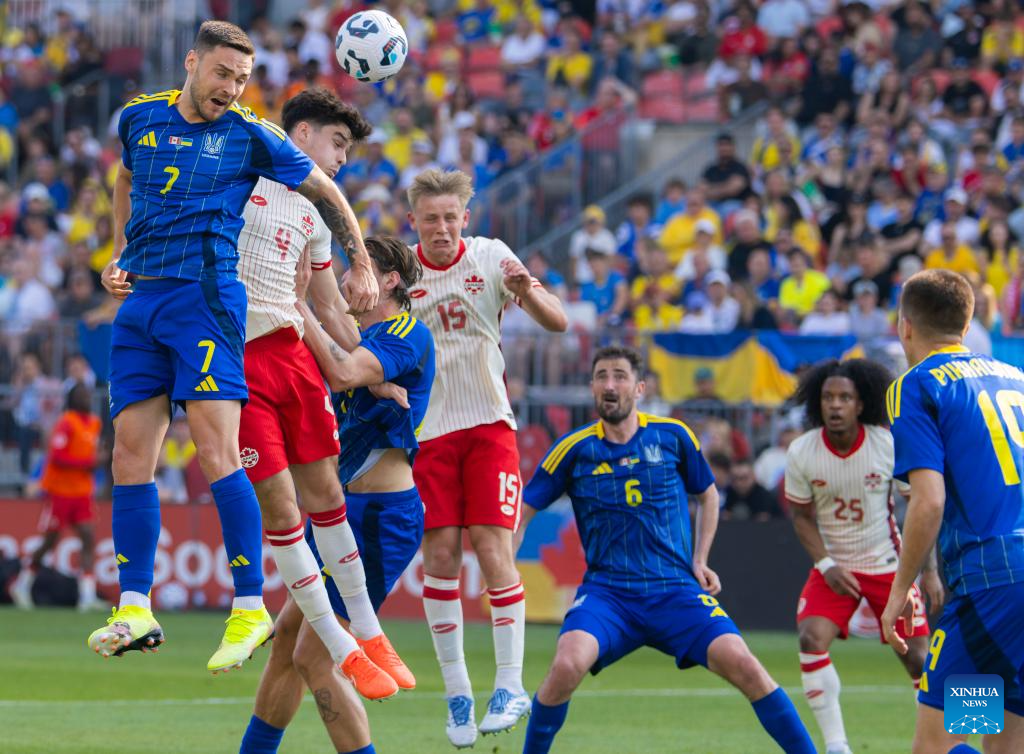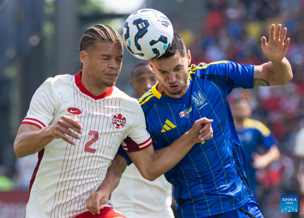 Zorhan Bassong (L) of Canada vies for a header with Roman Yaremchuk of Ukraine during the Canadian Shield Tournament football match between Canada and Ukraine at BMO Field in Toronto, Canada, June 7, 2025. (Photo by Zou Zheng/Xinhua)