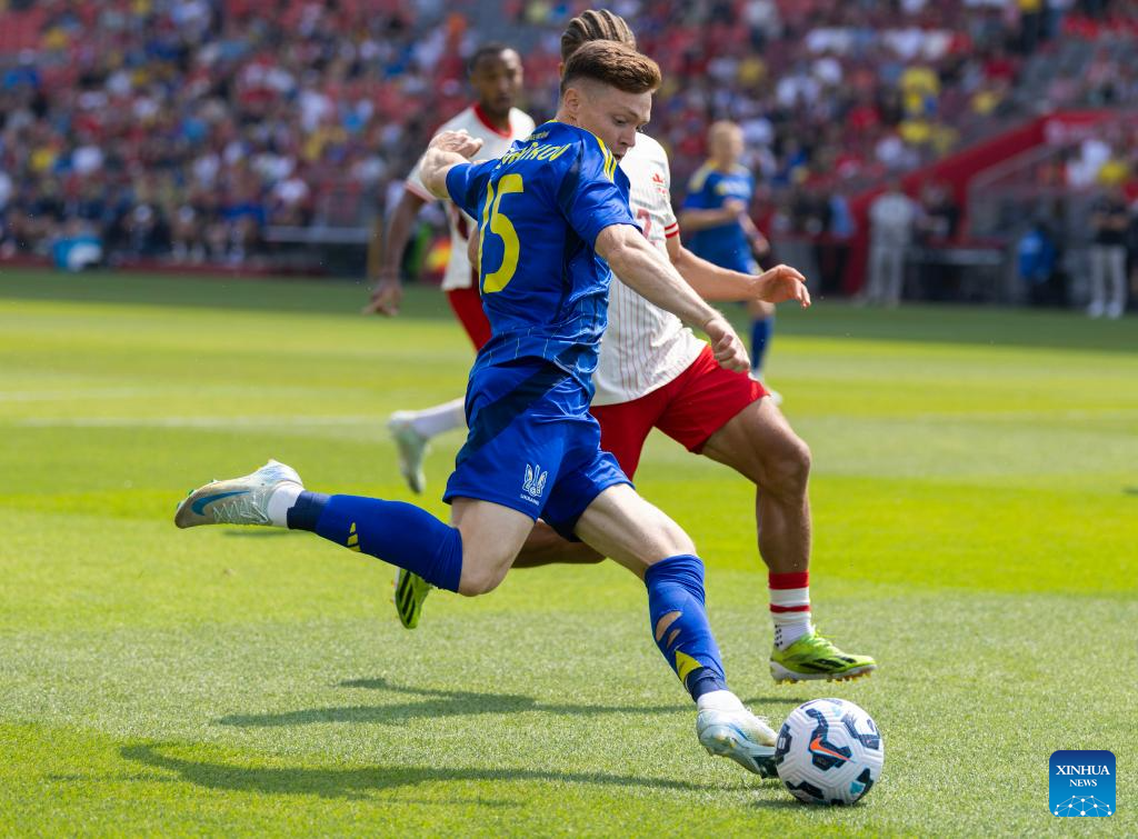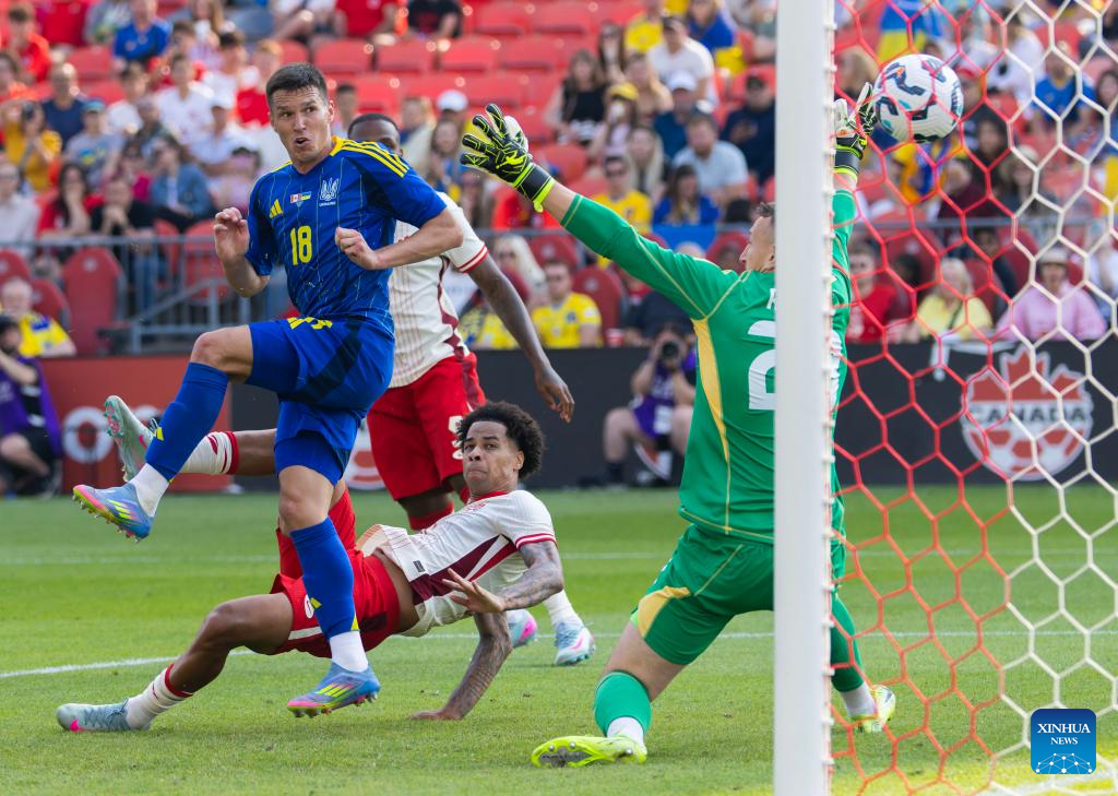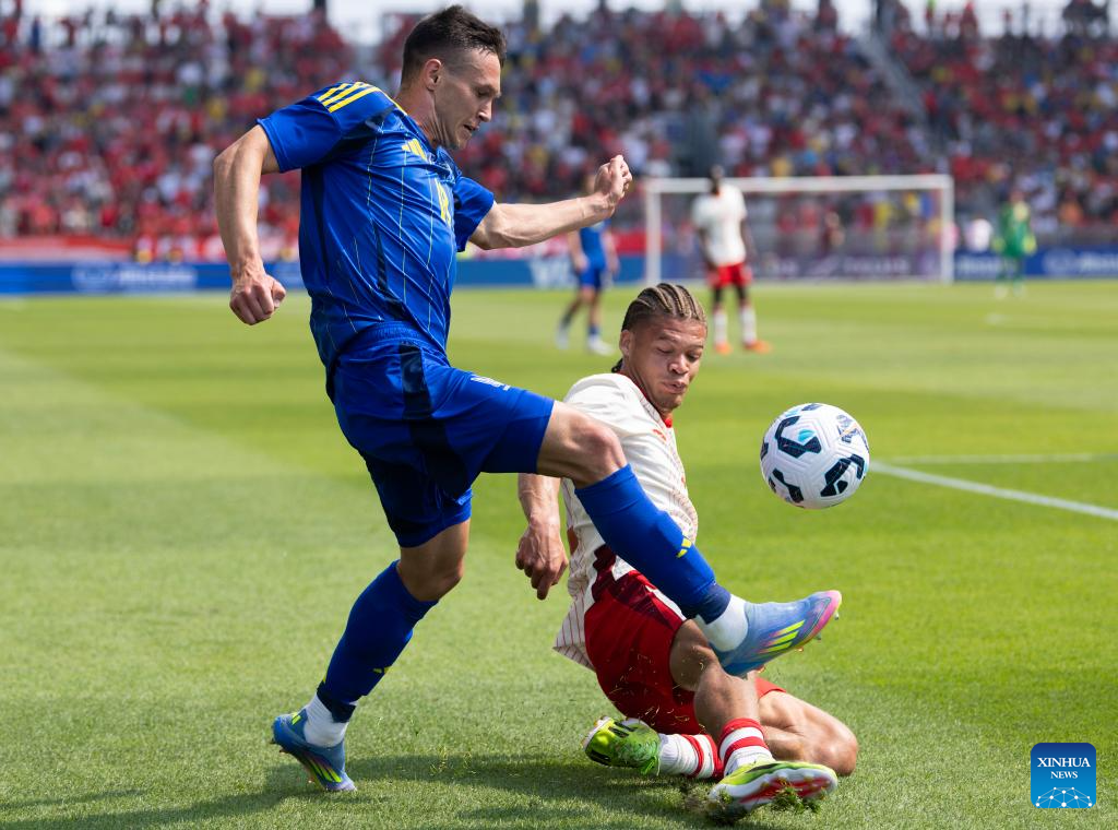 Viktor Tsyhankov (front) of Ukraine passes the ball during the Canadian Shield Tournament football match between Canada and Ukraine at BMO Field in Toronto, Canada, June 7, 2025. (Photo by Zou Zheng/Xinhua)
