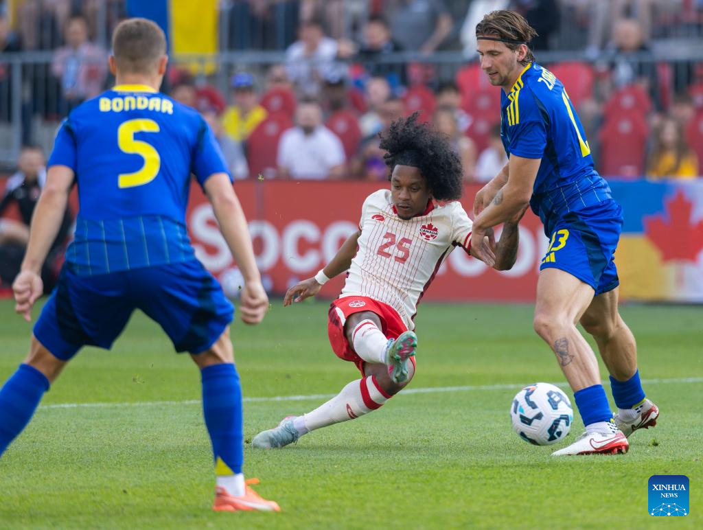 Jayden Nelson (C) of Canada shoots during the Canadian Shield Tournament football match between Canada and Ukraine at BMO Field in Toronto, Canada, June 7, 2025. (Photo by Zou Zheng/Xinhua)