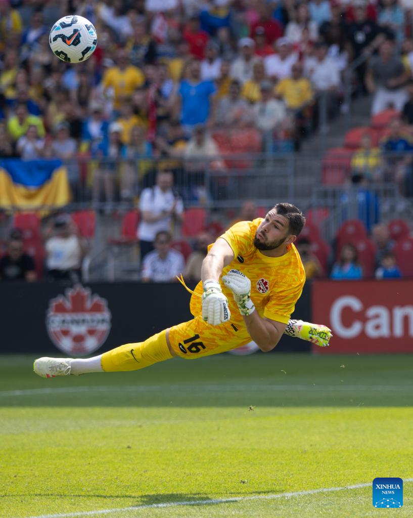 Goalkeeper Maxime Crepeau of Canada makes a save during the Canadian Shield Tournament football match between Canada and Ukraine at BMO Field in Toronto, Canada, June 7, 2025. (Photo by Zou Zheng/Xinhua)