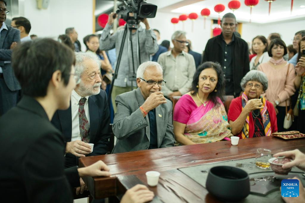 Mauritian President Dharam Gokhool (3rd L) tries tea during a cultural event "Tea for Harmony: Yaji Cultural Salon" in Port Louis, Mauritius, June 7, 2025. (China Cultural Center in Mauritius/Handout via Xinhua)
