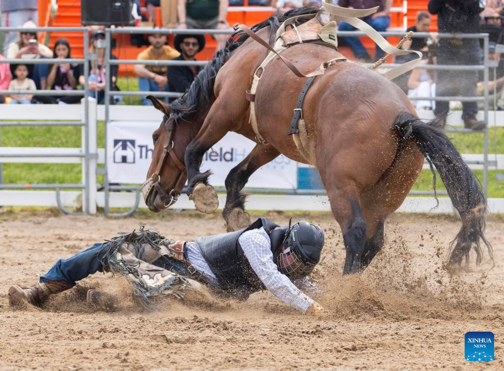 A cowboy falls in the bareback riding event at the 2025 RAM Rodeo Tour in Mono, Ontario, Canada, June 8, 2025. (Photo by Zou Zheng/Xinhua)