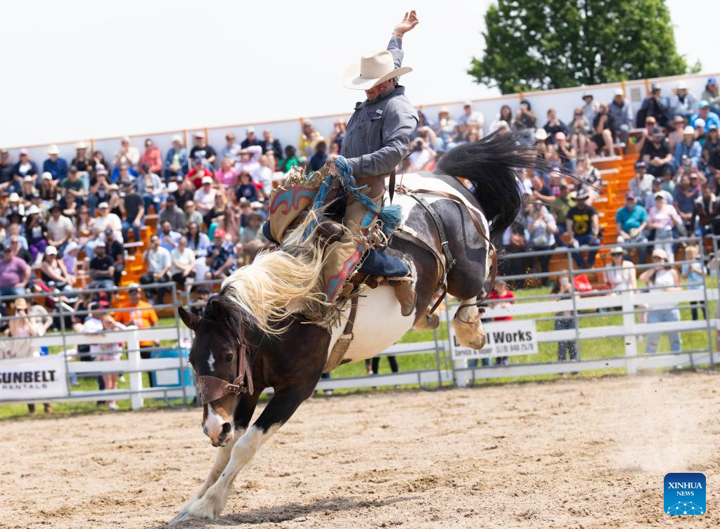 A cowboy competes in the saddle bronc event at the 2025 RAM Rodeo Tour in Mono, Ontario, Canada, June 8, 2025. (Photo by Zou Zheng/Xinhua)