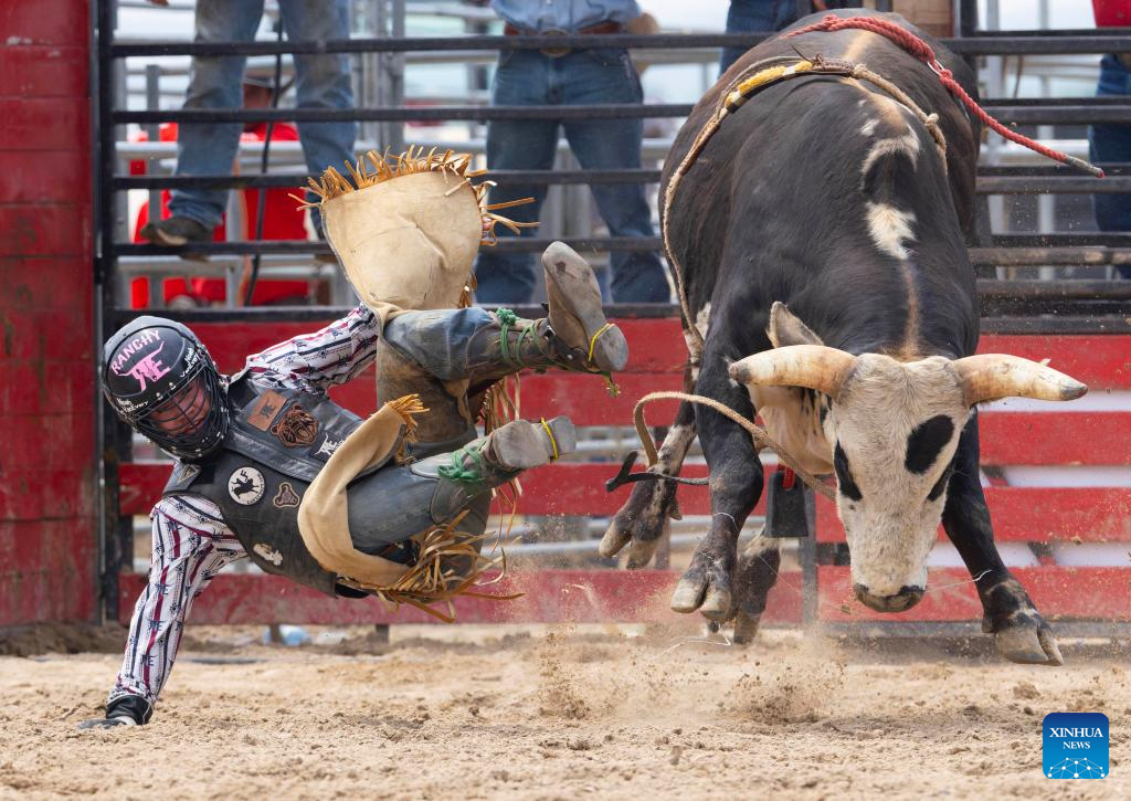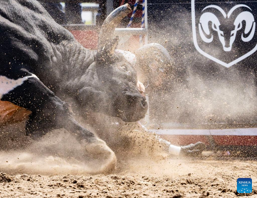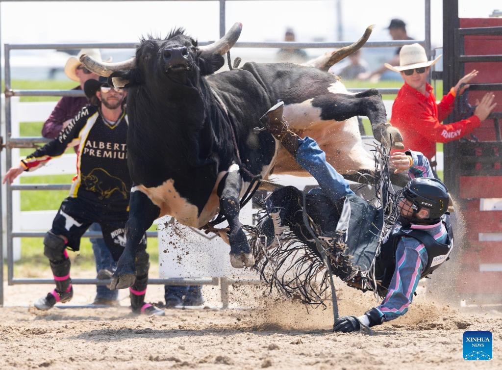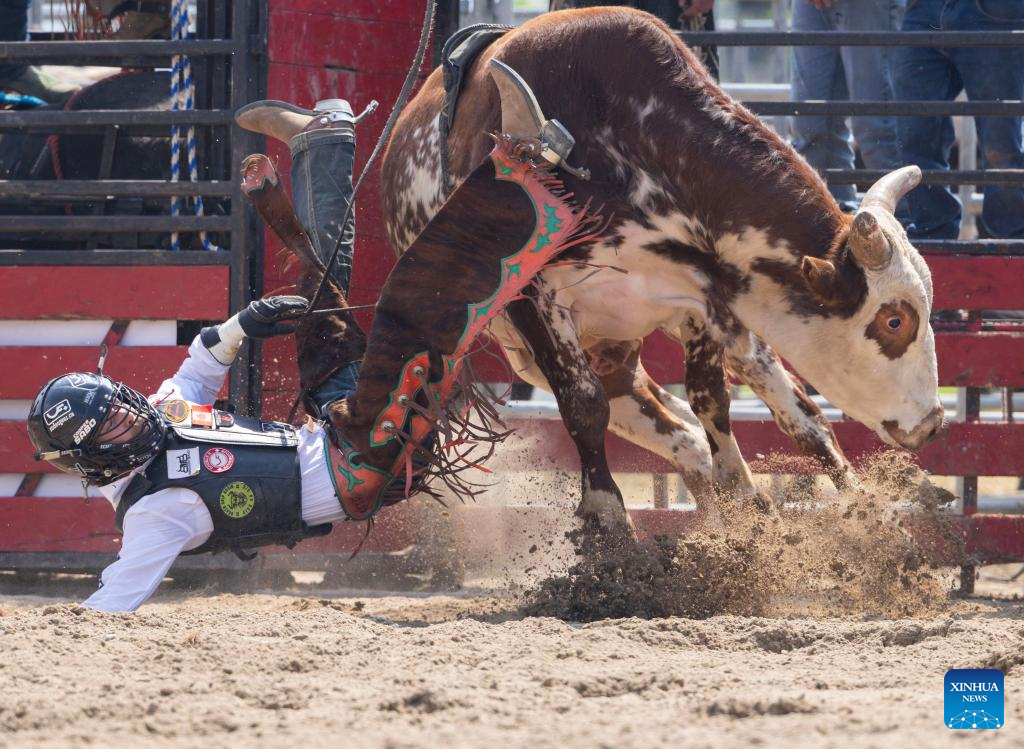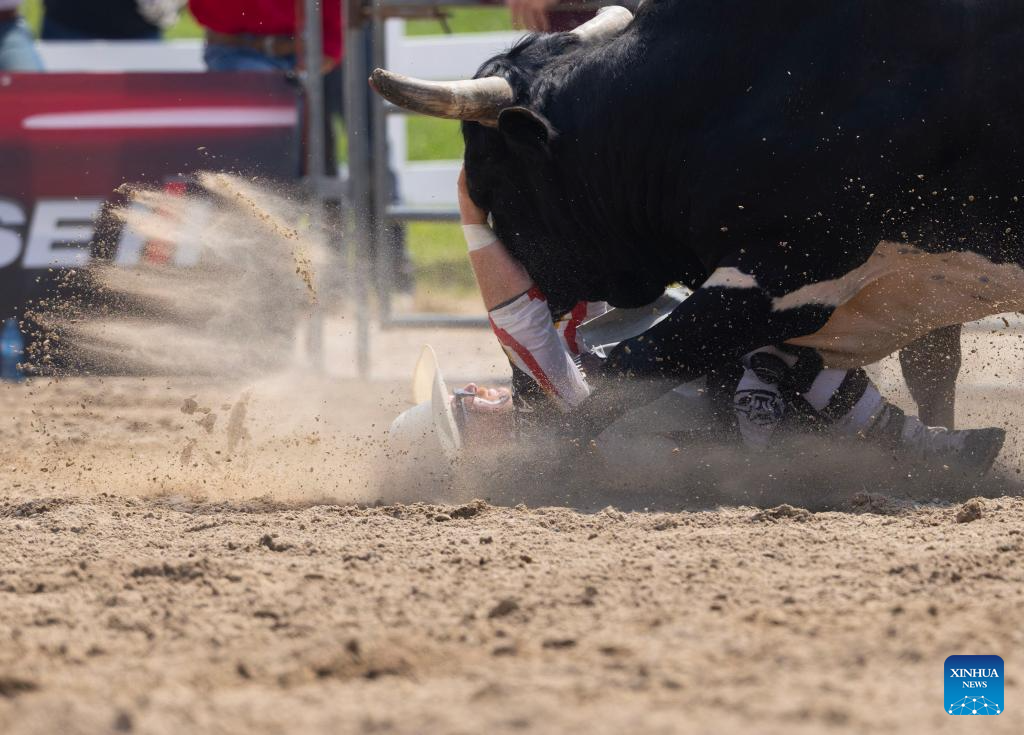 A cowboy falls in the bull riding event at the 2025 RAM Rodeo Tour in Mono, Ontario, Canada, June 8, 2025. (Photo by Zou Zheng/Xinhua)