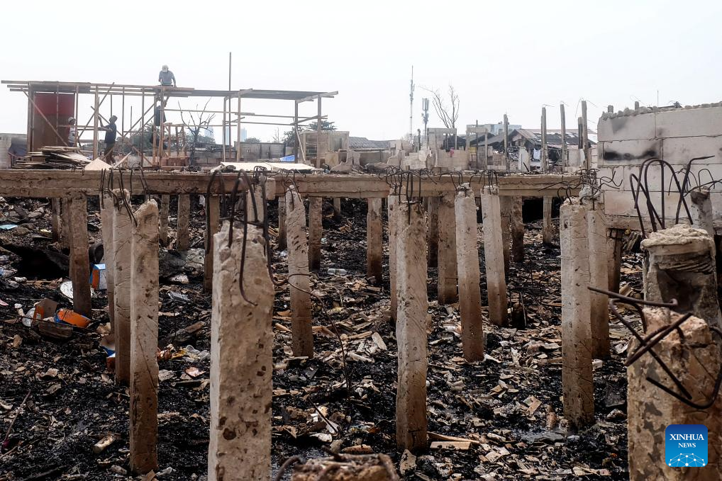 People build a semipermanent shelter near damaged houses after a fire hit the dense residential area at Kapuk Muara in Jakarta, Indonesia, June 9, 2025. (Xinhua/Agung Kuncahya B.)