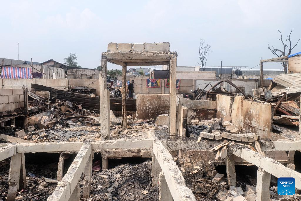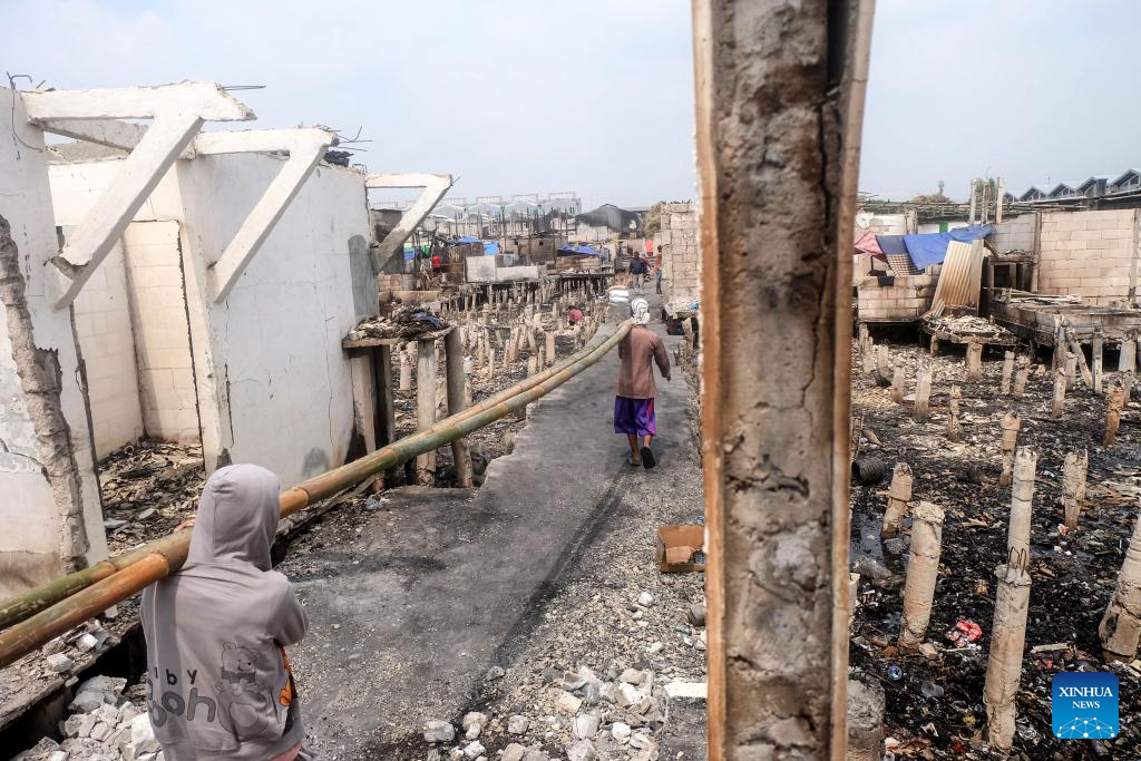 A man walks near damaged houses after a fire hit the dense residential area at Kapuk Muara in Jakarta, Indonesia, June 9, 2025. (Xinhua/Agung Kuncahya B.)