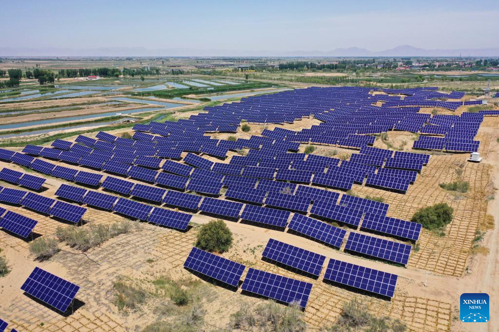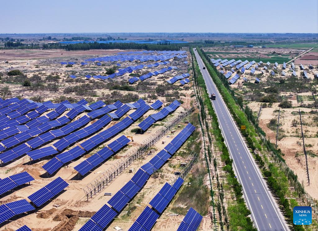An aerial drone photo taken on June 5, 2025 shows an integrated sand control and photovoltaic project at a state forestry area in the edge of Ulan Buh Desert in Linhe District of Bayannur, north China's Inner Mongolia Autonomous Region. In recent years, Inner Mongolia has made all-out efforts to tackle the ecological challenges in the areas along the Yellow River, and has treated land covering a total of 14.89 million mu (about 992,667 hectares).